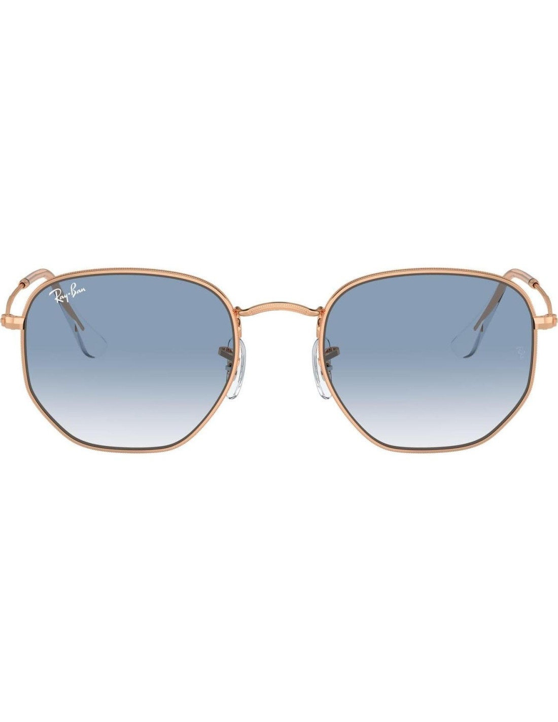 - CARACTERÍSTICAS DE LA MONTURA: Las gafas de sol RB3548 Hexagonales cuentan con una montura hexagonal de color oro rosa con patillas ultra delgadas y lentes degradados claros/azules.
