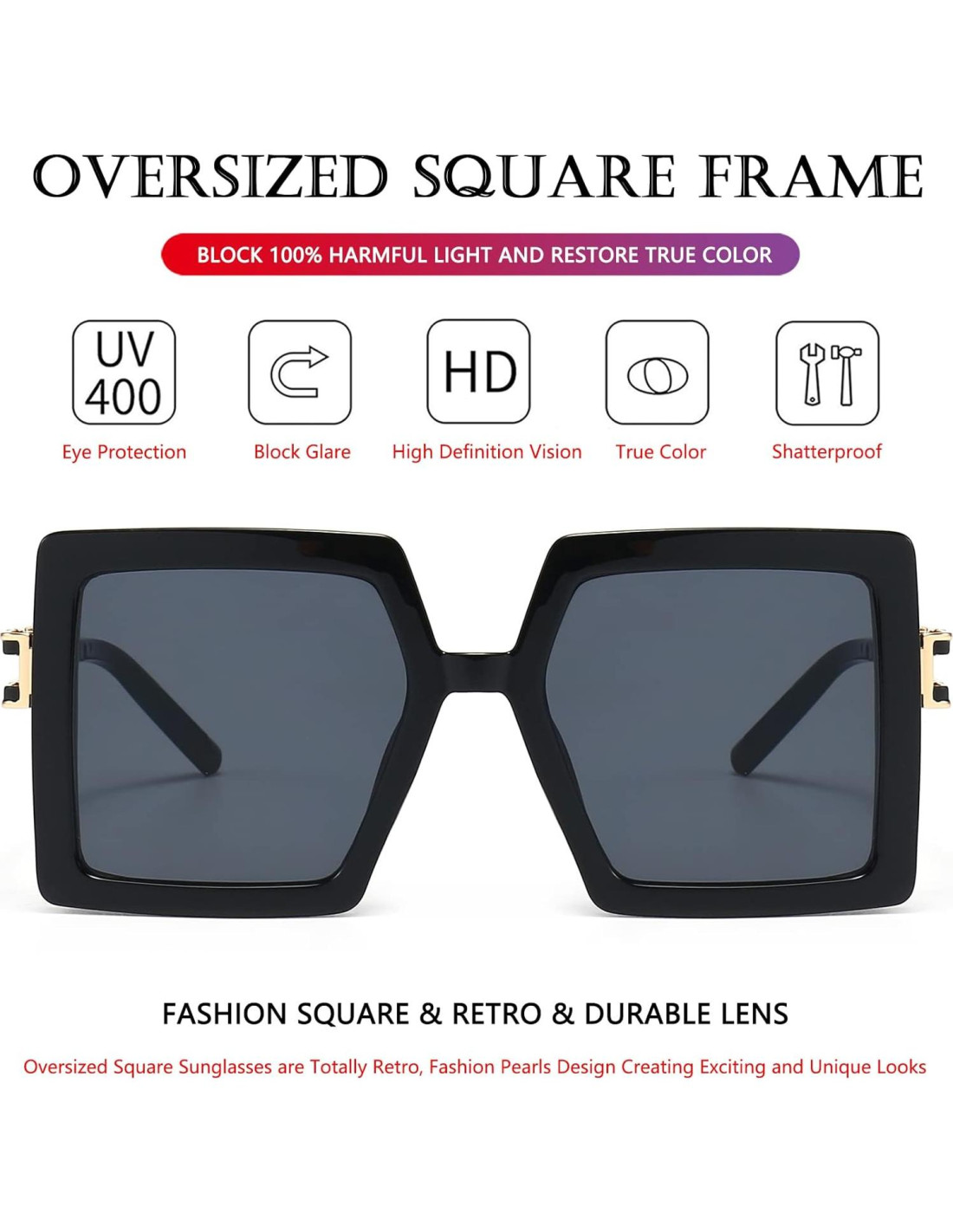 - GAFAS DE SOL CUADRADAS CON PROTECCIÓN UV400 Estas elegantes gafas de sol oversized pueden bloquear el 100% de los dañinos rayos UVA y UVB, protegiendo tus ojos contra daños UV a largo plazo. Lentes de alta definición que te brindan una visión natural y clara, manteniendo tus ojos saludables.