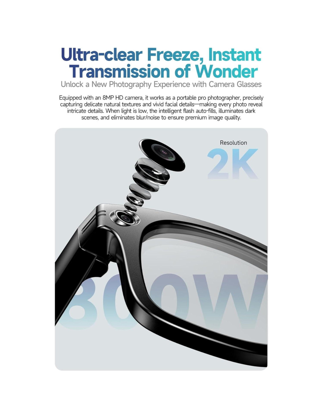- Gafas Inteligentes AI con Cámara HD: Captura fotos y videos de alta calidad con la cámara HD de 800W, con reconocimiento de objetos impulsado por IA y retroalimentación en tiempo real para mejorar experiencias de trabajo y estudio