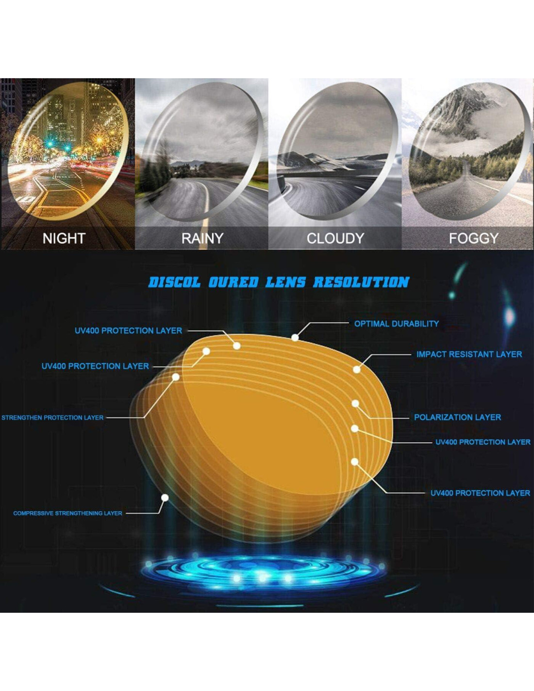 Prácticas Gafas de Visión Diurna Nuestras gafas son polarizadas con protección UV400, bloquean el 100% de los rayos dañinos para proteger tus ojos, suprimen efectivamente la reflexión difusa y el deslumbramiento de la superficie de la carretera y la nieve, te permiten ver claramente la vista natural, perfectas para conducir, jugar golf, pescar, viajar y actividades al aire libre durante el día. Gafas de Visión Nocturna Dedicadas Las lentes polarizadas de visión nocturna pueden filtrar la mayoría del deslumbramiento por la noche para reducir la fatiga ocular y mejorar la claridad del color. Te permiten tener una visión más clara al conducir de noche o en días nublados y lluviosos, manteniéndote más seguro durante el viaje. Características: El Marco de Aleación de Metal de Aluminio y Magnesio Ligero y Duradero: Apenas puedes sentirlas en tu cara, ¡pero son irrompibles! Lente Polarizada HD: Lente con protección UV400 al 100% que bloquea el 100% de los rayos dañinos UVA, UVB y UVC. ¡Las mejores gafas de sol polarizadas para hombres! Lentes Fotoquímicas: Las lentes se oscurecen cuando se exponen a la luz ultravioleta de la intensidad presente en la luz solar, pero no en la luz artificial, por lo que las lentes son oscuras en luz solar brillante, pero claras en condiciones de poca luz ambiental. Contenido del Paquete: 1 X Gafas de Sol Polarizadas Fotoquímicas 1 X Caja de Gafas 1 X Paño Suave para Gafas 1 X Tarjeta de Prueba Polarizada Consejos: Por favor, no uses gafas de sol a altas temperaturas durante largos períodos de tiempo, lo cual no es bueno para tu salud y las gafas. Las gafas de sol deben ser tratadas con cuidado para evitar daños y limpiadas regularmente. Limpia la lente usando agua jabonosa o detergente neutro, seca suavemente con el paño suave para gafas incluido. Cuando no necesites usarlas, guarda las gafas y los accesorios de vuelta en el estuche.