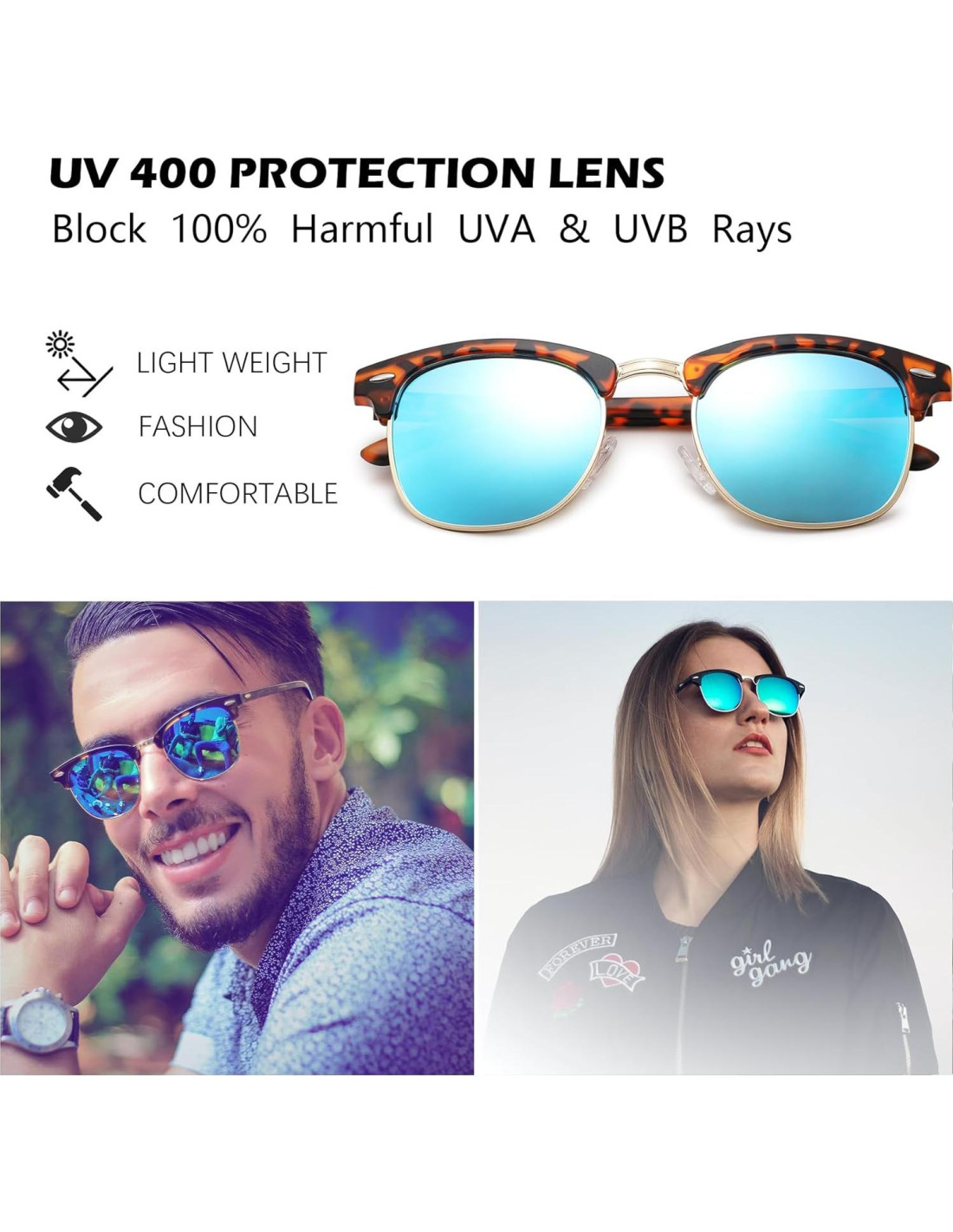 - [Alta Calidad] Sabemos la importancia de usar un par de gafas de sol cómodas para cada usuario, por lo que ponemos mucho énfasis en la calidad de las gafas de sol para mujeres y hombres. Para asegurar un uso duradero y comodidad, adoptamos material de alta gama para hacer un marco ligero y una almohadilla nasal cómoda, y no habrá presión en tu oído ni marcas en tu nariz.