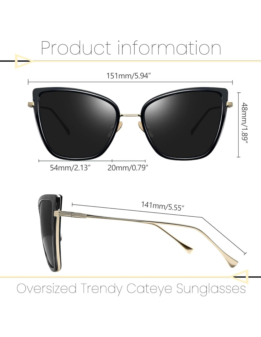 - Protección UV400: Las gafas de sol UV400 de Joopin para mujeres tienen una clasificación UV400, estas gafas de sol con protección UV400 pueden filtrar casi el 99% de los rayos UVA y UVB. Las gafas de sol de gran tamaño aumentan el área de protección y previenen mejor la cantidad de luz solar que llega a tus ojos. Usar las gafas de sol estilo gato de Joopin es más que solo moda, es una forma efectiva y moderna de proteger tus ojos. Un gran valor para las gafas de sol negras y doradas que pueden hacer que no te preocupes más por los rayos UV.