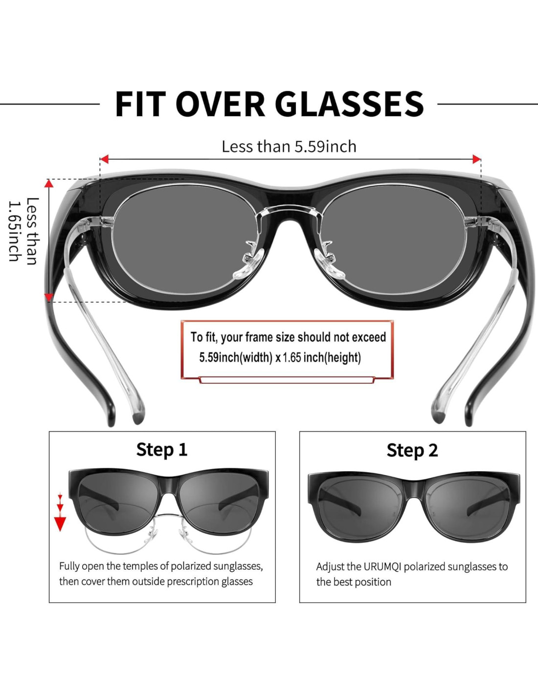 Las gafas de sol polarizadas URUMQI están diseñadas específicamente para aquellos que usan gafas recetadas. El marco grande y las patillas anchas proporcionan más cobertura para prevenir el deslumbramiento, perfectas para conducir, pescar, jugar golf, correr, etc. Protección UV400: La protección UV400 es el nivel más alto de protección que puede tener una lente. Se considera que proporciona cerca del 100% de protección contra los dañinos rayos ultravioleta. Polarizadas: Se añaden recubrimientos polarizados para reducir el molesto deslumbramiento reflejado de carreteras, nieve, agua y otras superficies horizontales, haciendo que las vistas sean claras sin deslumbrar. Gafas de sol envolventes que se ajustan sobre gafas recetadas: Las gafas de sol polarizadas se pueden usar directamente sobre las gafas existentes, ahorrando muchos problemas para aquellos que tienen que usar gafas recetadas. El diseño ergonómico envolvente y la gran lente de ojo de gato proporcionan una protección integral contra el deslumbramiento, alivian la fatiga ocular y reducen el riesgo al conducir. Marco TR90 ligero y flexible asegura durabilidad: TR90 es un tipo de material polimérico de memoria, que es el material de marco ultra-ligero más popular del mundo. Materiales duraderos con super resistencia pueden soportar altos impactos de deportes al aire libre y evitar daños a los ojos y la cara debido a fracturas y fricción del marco. ¿Las gafas de sol polarizadas URUMQI se ajustan sobre tus gafas recetadas? 1. Mide la parte más ancha de tus monturas recetadas de izquierda a derecha, esta es la 'anchura'. Luego mide la altura de la lente con el marco incluido. 2. Asegúrate de que el marco URUMQI sea ligeramente más grande en anchura y altura que tus medidas de marco. El paquete incluye: 1 * Gafas Fitovers 1 * Tarjeta de prueba polarizada 1 * Paño de limpieza de microfibra 1 * Bolsa de gafas de microfibra