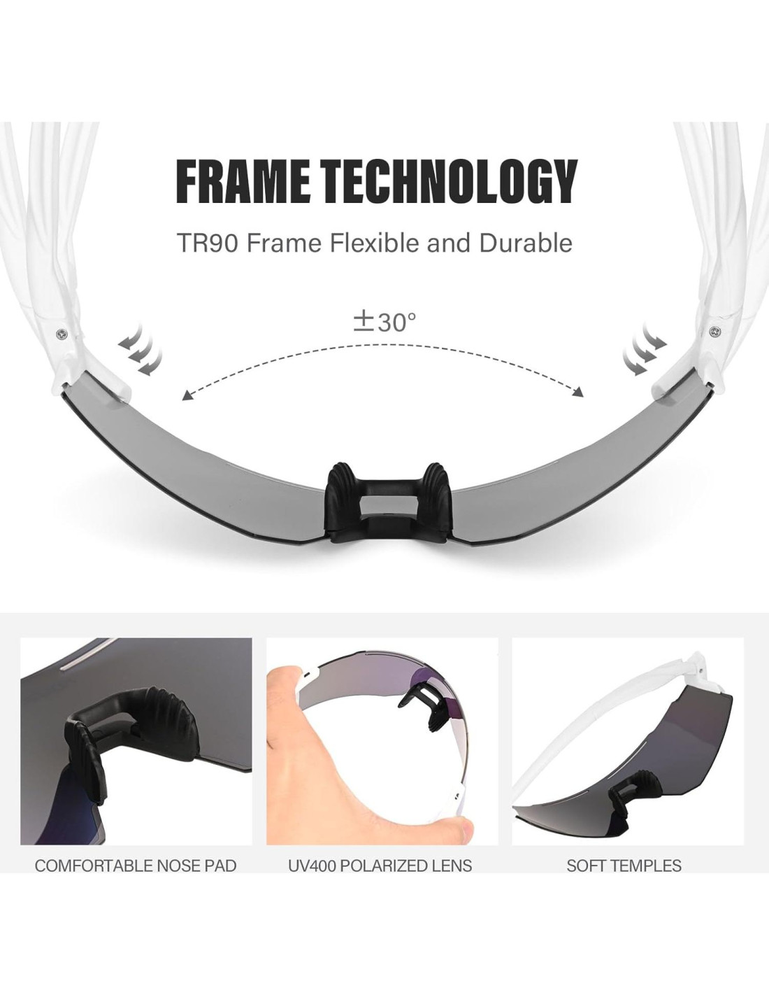 - Lente HD TAC integrada de una sola pieza. Las lentes polarizadas de alta calidad pueden mostrarte el mundo más realista y colorido. Para aumentar el contraste y profundizar la percepción, el diseño de lente de una sola pieza proporciona un campo de visión más amplio y hace que las gafas de ciclismo sean más efectivas contra el viento.