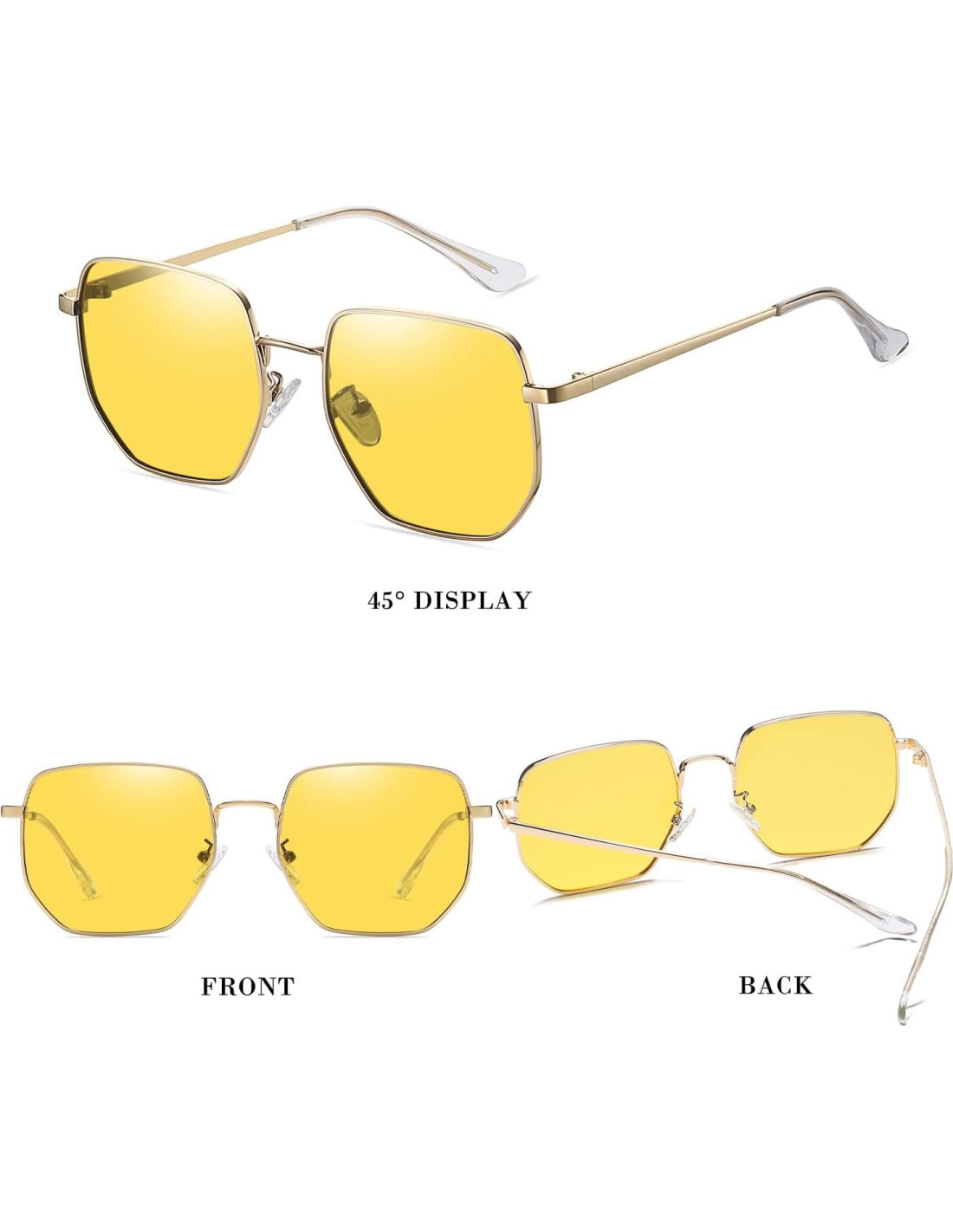 - LENTES POLARIZADOS HD UV400 - Las gafas de sol poligonales con lentes amarillos bloquean el 100% de la radiación UVA y UVB mientras filtran el deslumbramiento reflejado de superficies horizontales. Las gafas de sol polarizadas protegen tus ojos del daño UV a largo plazo, mejoran la claridad visual y realzan la percepción del color. Te permiten disfrutar de tu diversión al sol.