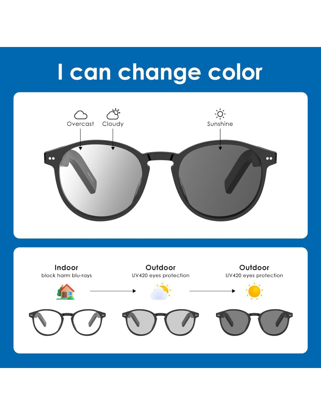- [Gafas de Traducción AI que Cambian de Color] : Lentes adaptativas que se ajustan a las condiciones de luz, reduciendo la fatiga ocular y proporcionando una visión clara y cómoda todo el día. Las gafas inteligentes son perfectas para viajes transfronterizos, con la aplicación Smart que ofrece cuatro modos de traducción: diálogo AI (Impulsado por ChatGPT), traducción AI multilingüe, voz a texto y traducción cara a cara. Soportando 17 idiomas, cubren Europa, América, Asia y América Latina, asegurando una comunicación fluida durante tus viajes.