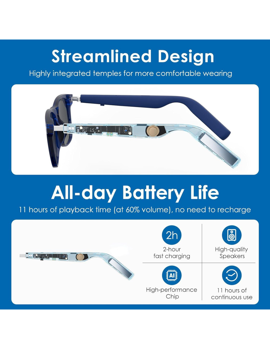 - Gafas de música: Las gafas de música inteligentes GetD están equipadas con la última tecnología Bluetooth 5.4, asegurando una conexión estable y soporte sin interrupciones para los códecs AAC de Apple y Android. Cada patilla cuenta con salidas de sonido duales para efectos estéreo mejorados, combinadas con la avanzada tecnología de ganancia de audio de GetD. Esta combinación ofrece una calidad de sonido superior, haciendo que cada experiencia de escucha sea más rica e inmersiva. Perfectas para disfrutar de música en movimiento.