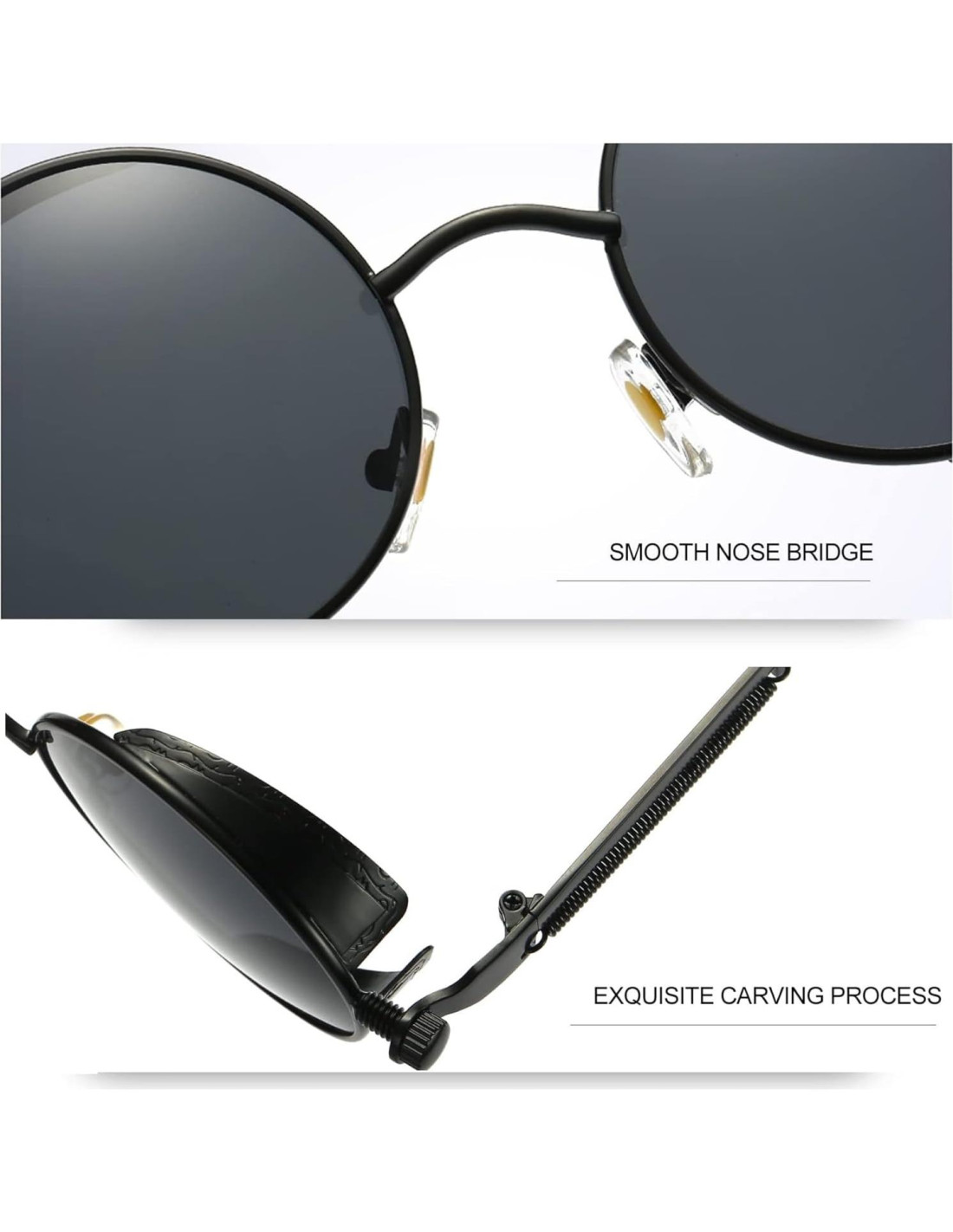 - Marco metálico redondo perfecto, único y de moda: Materiales de marco de aleación metálica importados, elegantes almohadillas nasales de silicona suaves, lentes polarizados redondos, creación de sombras de sol redondas perfectas que te mantienen enamorado de ellas. Diseño único de marco metálico con hermoso patrón impreso que te hace lucir diferente en la calle. No olvides llevar las gafas de sol redondas Joopin cuando salgas a comprar, a la playa, a fiestas, a conducir, a correr, a pescar, a andar en bicicleta, a cualquier actividad al aire libre.