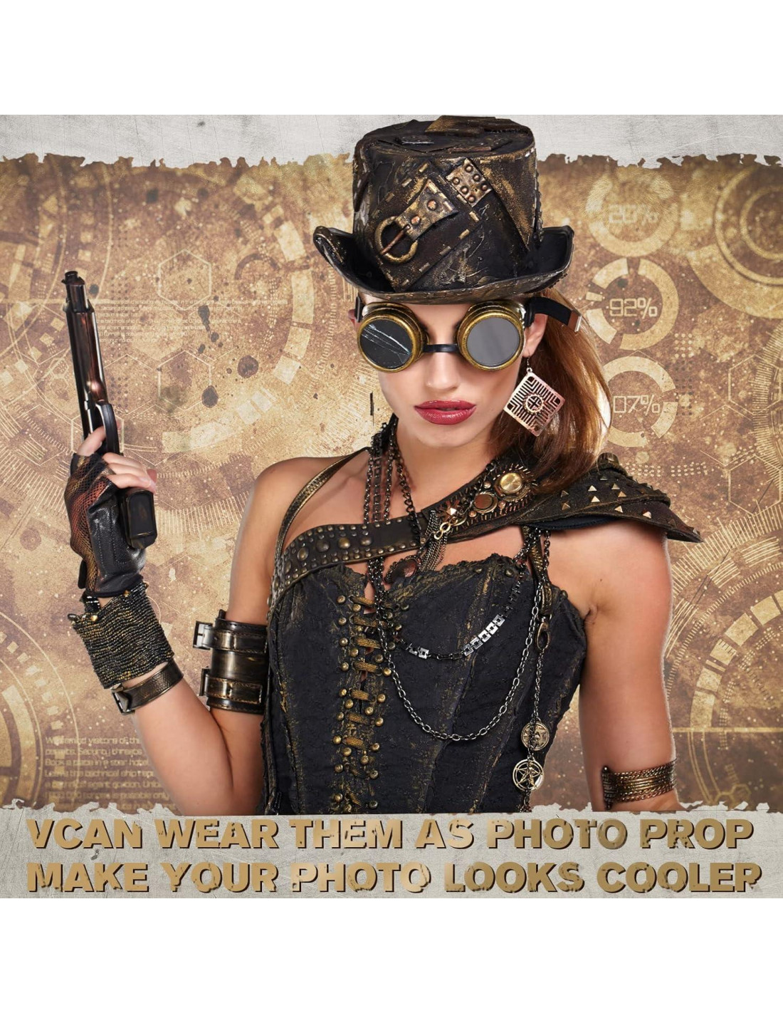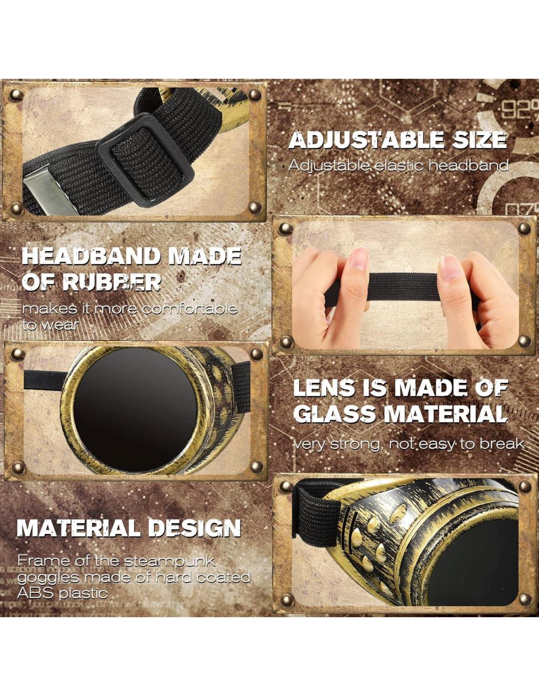 - Diseño de Material: el marco de las gafas steampunk está hecho de plástico ABS recubierto duro para darte una sensación vintage, con orificios en los lados para ofrecer una vista fantástica; La lente está hecha de material de vidrio, que es muy resistente, no fácil de romper y diseñado para proporcionar resistencia al impacto