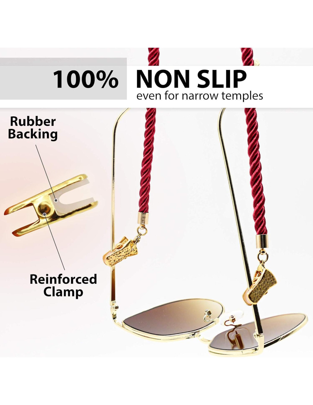 - Consejos 100% Antideslizantes - Nuestra correa para gafas viene con 3 tipos de consejos: pinzas de cocodrilo, bucles de silicona y cierre de joyería para adaptarse como correa de gafas en patillas anchas, como cadena de accesorio para gafas en patillas delgadas y como soporte para mascarilla