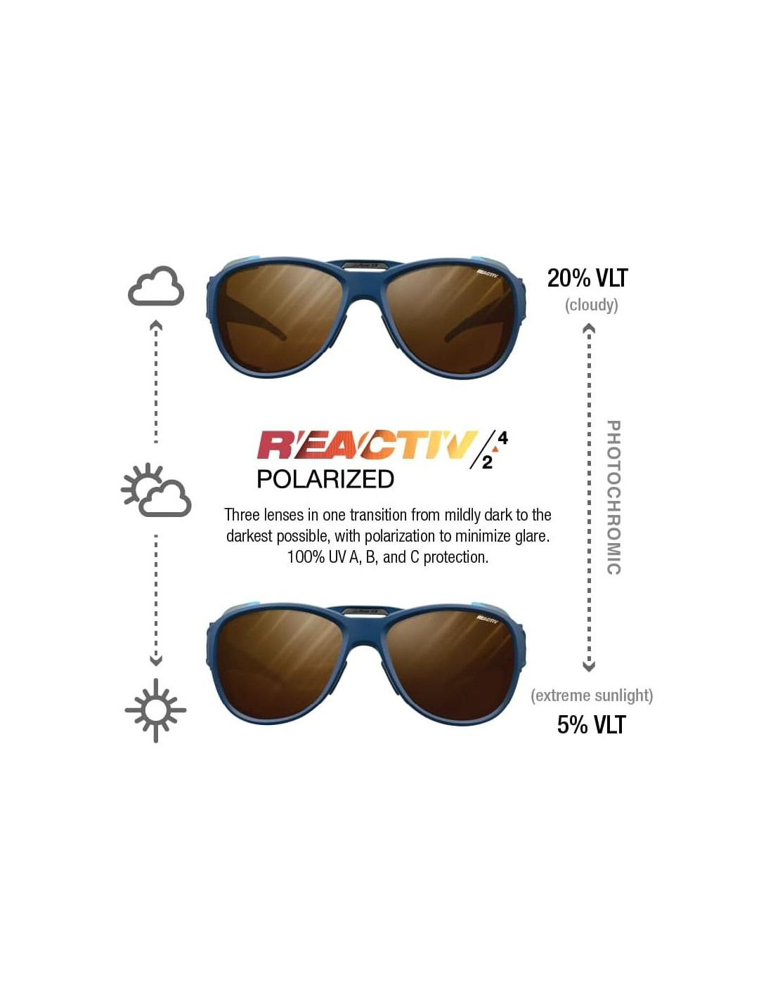 - LENTE POLARIZADA REACTIV 2-4: Lente polarizada y fotocromática que se activa y ajusta rápida y automáticamente según las condiciones de luz cambiantes. Cuenta con un recubrimiento antifog y protección mejorada contra deslumbramientos dañinos, con 100% de protección UVA, B y C. Adecuada para deportes de alta montaña. Tasa de transmisión de luz visible: 5% - 20%.