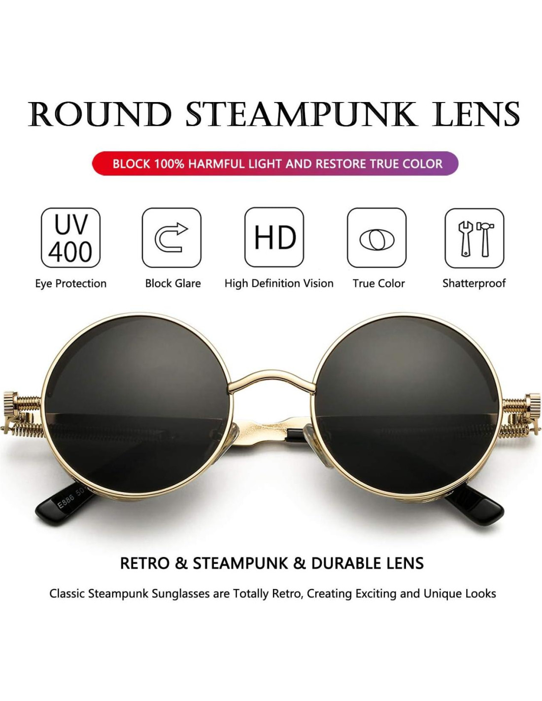 - MARCO REDONDO STEAMPUNK - Diseño ergonómico del marco, una barra de ceño curvada, bisagra de metal reforzada, almohadillas nasales ajustables y delgadas patillas de metal con puntas de plástico, el diseño clásico hace que estas gafas de sol steampunk para hombres y mujeres sean más cómodas y duraderas mientras las usas