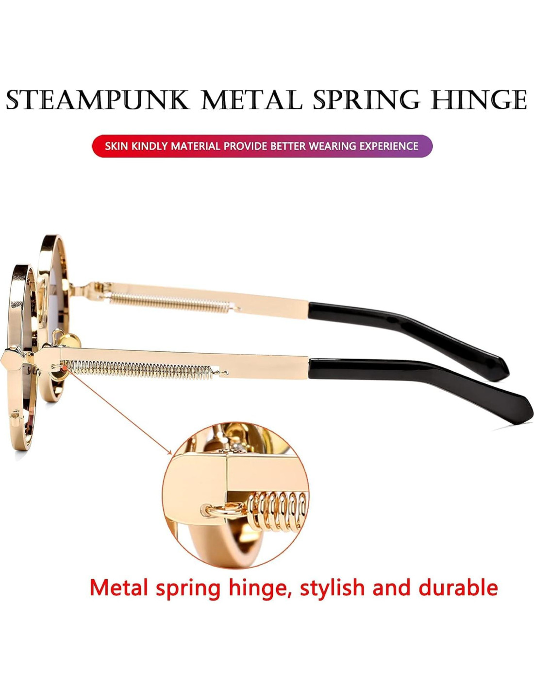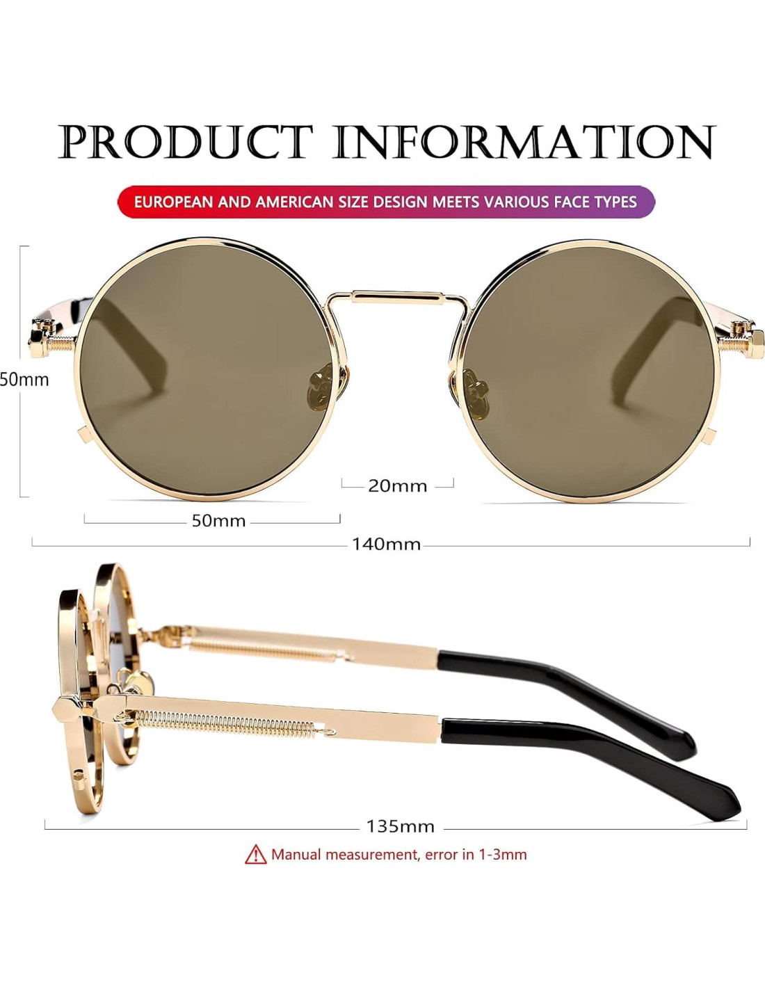 - MARCO REDONDO RETRO PEQUEÑO - Diseño ergonómico del marco, una barra de cejas curvada, bisagra de metal reforzada, almohadillas nasales ajustables y materiales amigables con la piel, muelles en las patillas, el diseño clásico hace que estas gafas de sol steampunk para hombres y mujeres sean más cómodas y duraderas mientras las usas
