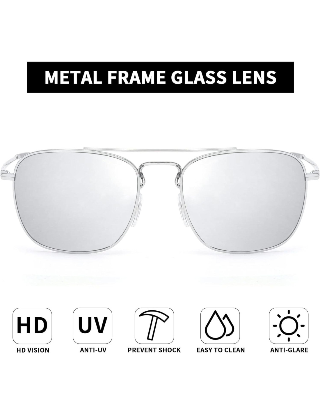 - Diseño de moda y estilo - Las gafas de sol aviador cuadradas para hombres y mujeres con almohadillas nasales ajustables son adecuadas para cualquier rostro. Montura de metal de aleación y lentes de vidrio son resistentes a impactos, arañazos y duraderas.