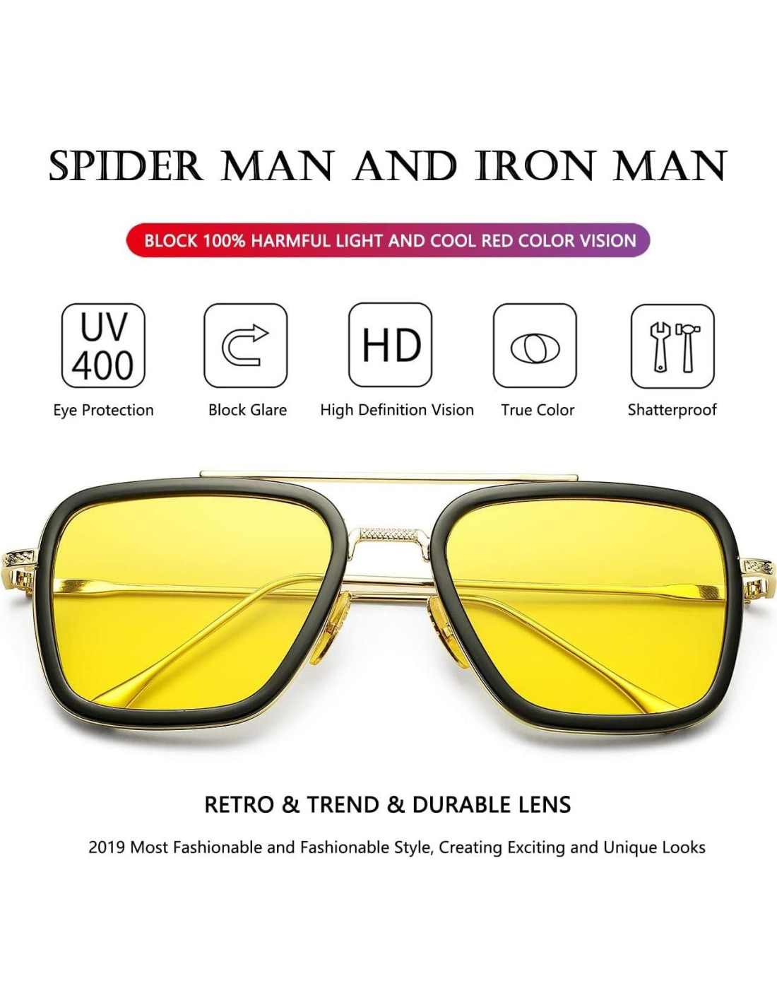 - DISEÑO CLÁSICO Y ESTILOSO DE MARCA - Personaje clásico de película Tony Stark diseñado para la moda de 2019. Uno a uno para crear el estilo original, una variedad de colores, colorea tu mundo y complementa tu look con una visión perfecta sin deslumbramiento. Desvía las miradas envidiosas y te da ese aspecto único.