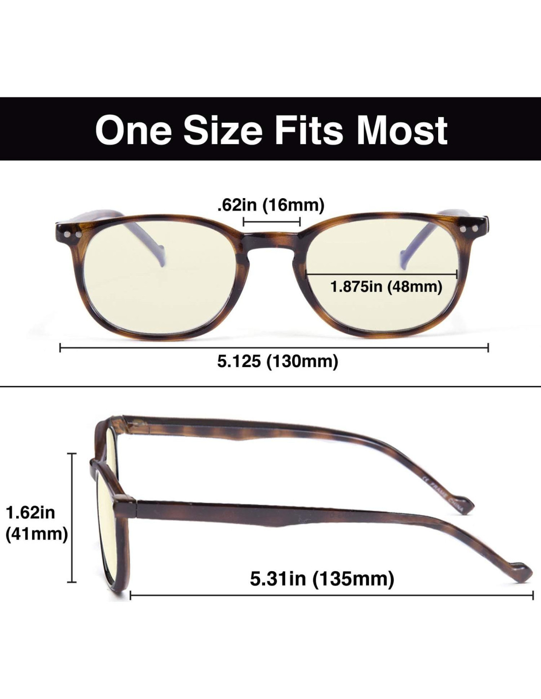 - El paquete incluye: 1 par - Gafas para computadora con lentes tintados ámbar para minimizar la fatiga visual digital causada por la luz azul dañina emitida por pantallas digitales. Estuche para llevar y paño de limpieza incluidos.