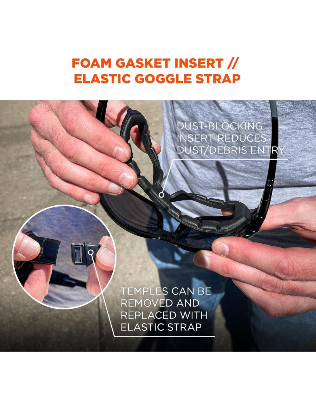 - Las patillas se desmontan y la correa elástica (incluida) se coloca en su lugar para convertir las gafas de sol de seguridad en gafas de seguridad