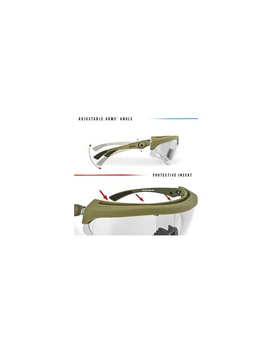 Armazón en policarbonato anticrash con acabado mate de toque terciopelo en verde militar - Ángulo de lente ajustable para personalizar el ajuste. Lente: policarbonato antivaho de 2,6mm. de grosor, anticrash, 100% protección UV - Lente Clara: protectora y mejor solución para necesidades de tiro en baja luz o de noche, permite acentuar el objetivo. Supera los estándares ANSI Z87.1, ECE, EN166 y la prueba de caída para gafas y gafas de tiro. Revestimiento de goma suave dentro del armazón frontal para una protección y ajuste perfectos, con aireadores antivaho - Agarre en la punta del brazo y puente nasal: evita que las gafas se deslicen. Diseño envolvente: protege los ojos del viento y mal tiempo, proporciona una visión periférica mejorada. Armazón en policarbonato anticrash con acabado mate de toque terciopelo en verde militar - Ángulo de lente ajustable para personalizar el ajuste. Revestimiento de goma suave dentro del armazón frontal para una protección y ajuste perfectos, con aireadores antivaho - Agarre en la punta del brazo y puente nasal: evita que las gafas se deslicen. Lente: policarbonato antivaho de 2,6mm. de grosor, anticrash, 100% protección UV. Diseño envolvente: protege los ojos del viento y mal tiempo, proporciona una visión periférica mejorada.