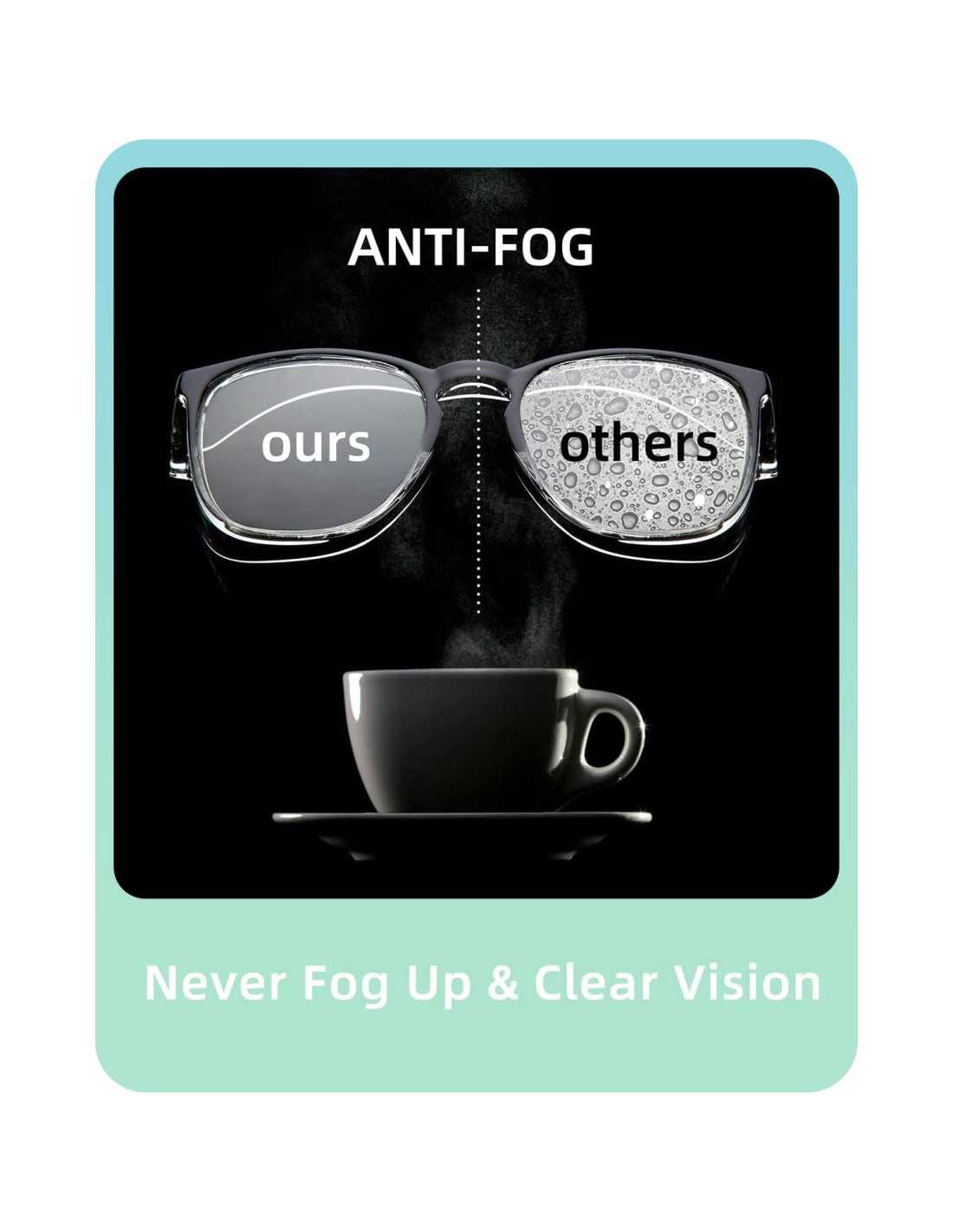 - LENTE ANTI-NIEBLA - Otra característica más importante de nuestras gafas de seguridad es la lente anti-niebla. Viene con un recubrimiento de doble cara, que mantiene la visión clara incluso al beber agua caliente. Además, la característica anti-niebla podría durar aproximadamente 2 años.