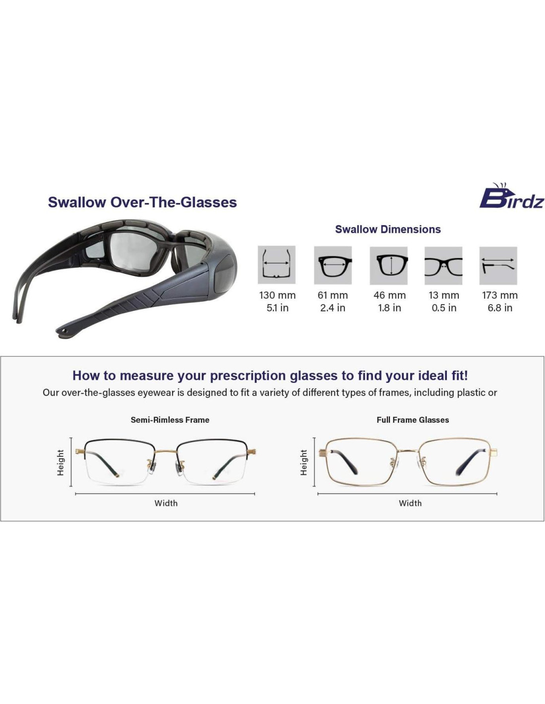 Mantén tu línea de visión clara y tus ojos protegidos con nuestras gafas deportivas Birdz Eyewear Fit-Over OTG (sobre las gafas). No te preocupes por cambiar entre costosas gafas de sol deportivas con receta y tus gafas de receta normales. No reseques tus ojos con incómodas lentes de contacto. Mantén tus gafas de receta normales y simplemente ponte un par de estas, que se ajustan cómodamente sobre la mayoría de los armazones de receta. La densa almohadilla de espuma ofrece un confort supremo y una protección suprema contra los escombros en el aire y el viento. Las lentes de policarbonato irrompibles y antiempañantes cumplen o superan todos los estándares de seguridad ANSI y proporcionan un 100% de protección contra los dañinos rayos UVA y UVB del sol. Fabricadas con nylon de alta calidad, los armazones negros mate vienen con una correa opcional que puedes comprar por separado para un ajuste extra seguro. Estas gafas de seguridad que se colocan sobre las gafas están disponibles con lentes amarillos, ahumados y claros. Sigue adelante. Trabaja duro. Juega seguro. Estas gafas Birdz Eyewear te tienen cubierto.