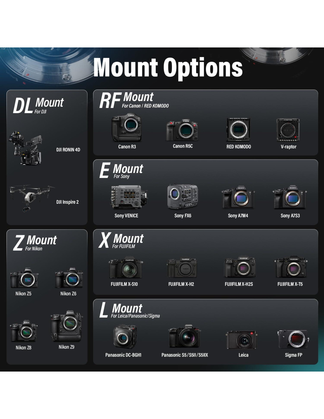 - Factor de Compresión Premium 1.6x: Esta anamórfica es equivalente al FOV horizontal de una lente esférica FF de 22mm. Este factor de compresión premium ofrece imágenes con una relación de aspecto de 2.4:1 al usar un modo de sensor 3:2 y logra un marco aún más amplio de 2.8:1 al disparar en modo 16:9, ofreciendo un ángulo de visión más amplio y presentando la clave del mundo cinematográfico de pantalla ancha.