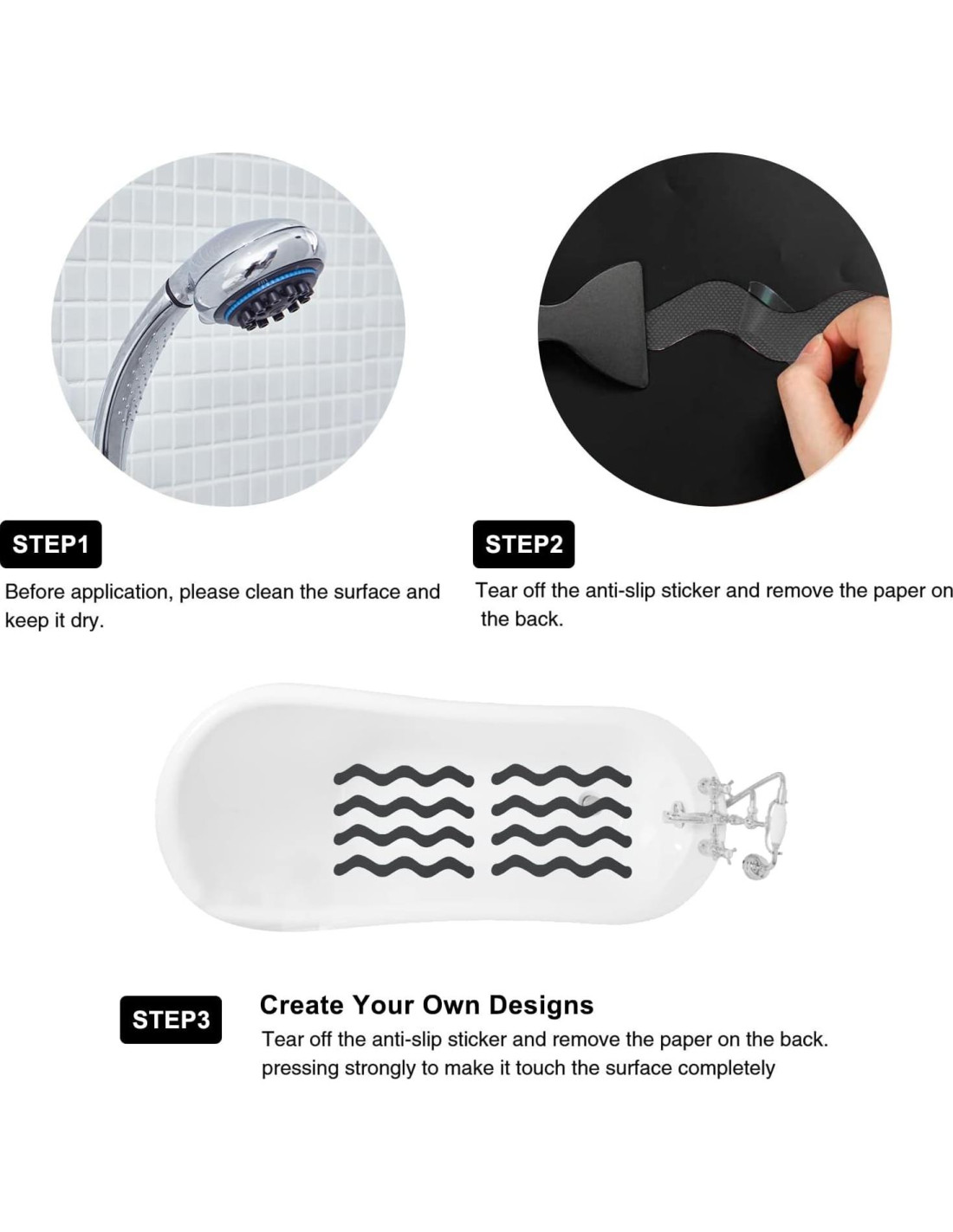 - Material de seguridad: La tira antideslizante está hecha de material PEVA de alta calidad. La tira de bañera antideslizante es ecológica, suave, resistente al desgaste, antideslizante, impermeable y tiene una fuerte adherencia. Las pegatinas para bañera son más ligeras y funcionales que otras marcas de alfombrillas de baño. Es seguro de usar, fácil de desmontar, fácil de mantener y no deja residuos.