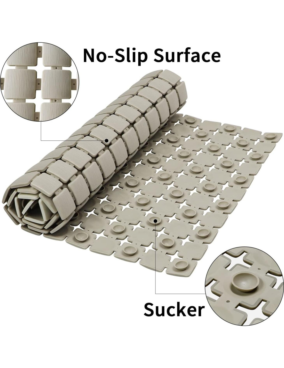 - Hay más de 130 ventosas en la parte inferior que se adhieren muy bien y mantienen la alfombra en su lugar en todo momento sin deslizarse. Los paneles ranurados y el diseño de superficie texturizada también tienen un buen rendimiento antideslizante, proporcionando un apoyo seguro y cómodo para proteger contra caídas, incluso si toca el gel de ducha no se deslizará.