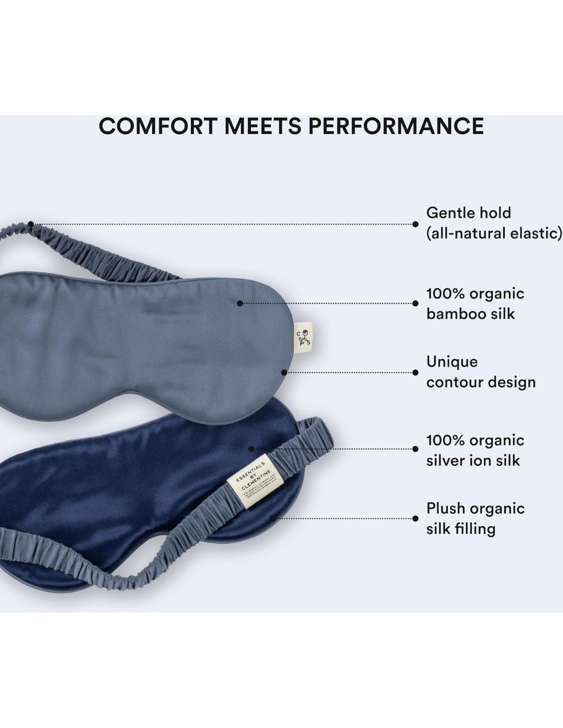 - Máscara de sueño de seda natural bicolor con forro de bambú y iones de plata: Un lado presenta bambú orgánico suave y transpirable, mientras que el otro lado se coloca contra tu piel con seda de iones de plata orgánica certificada para calmar la irritación y retener la hidratación.