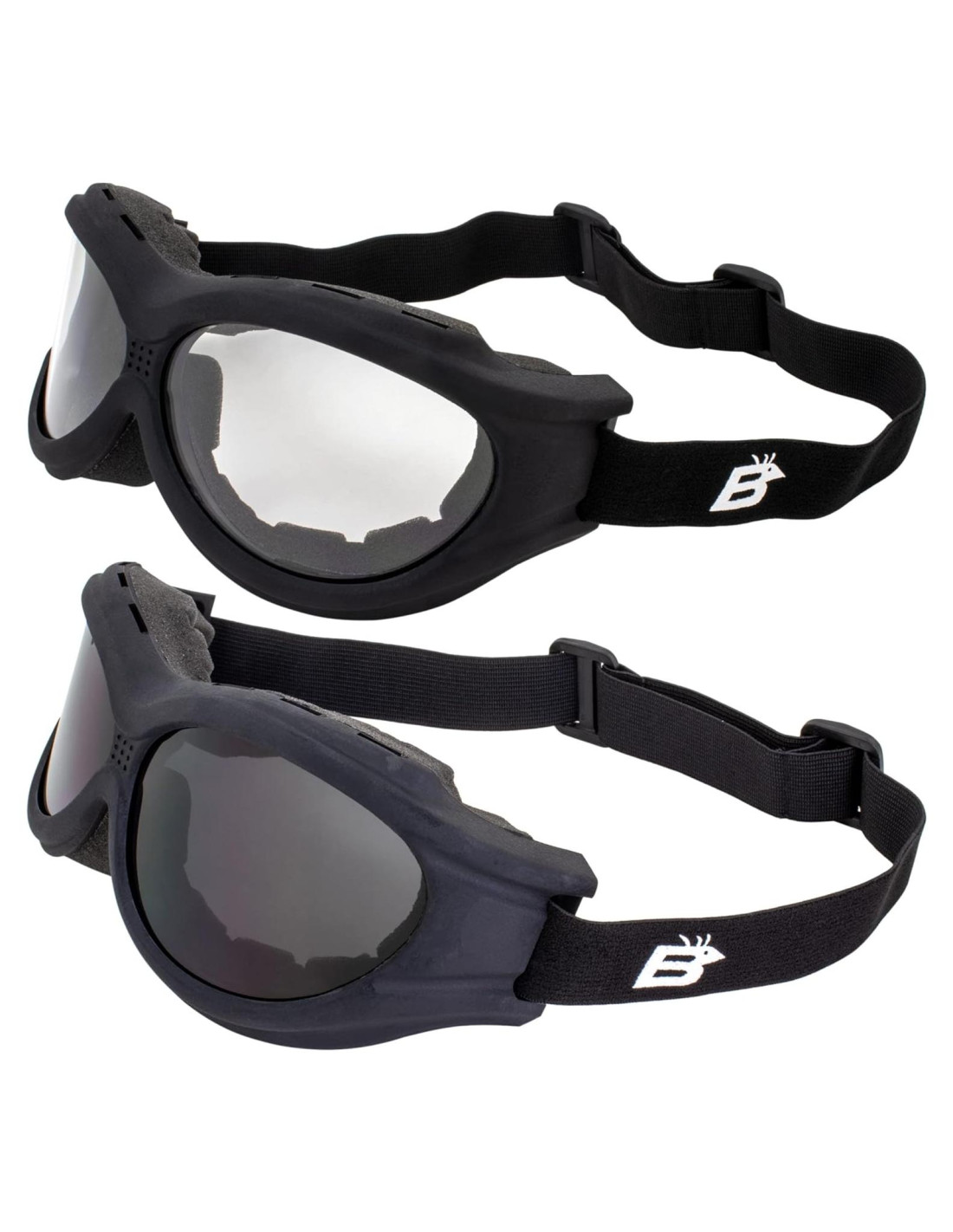 Desde tormentas de arena en el desierto hasta viento y lluvia en la carretera, las Gafas de Motocicleta Birdz Eyewear Buzzard Fit Over protegen tus ojos de los elementos mientras mantienen un ajuste cómodo. Mantén tus gafas recetadas puestas. No te preocupes por usar lentes de contacto que seguramente secarán tus ojos. No inviertas en costosas gafas recetadas que tendrás que cambiar por tus gafas regulares. Simplemente coloca nuestras Gafas Birdz Eyewear Buzzard diseñadas para ajustarse cómodamente sobre la mayoría de las gafas recetadas. Con un marco flexible y duradero y un acolchado de espuma suave y aireada, estas gafas se adaptan a tu rostro para un ajuste perfecto y perfectamente cómodo sin importar cuánto dure tu viaje. El acolchado de espuma protege tus ojos del viento, el polvo y otros desechos. Las lentes de policarbonato irrompibles vienen con un recubrimiento resistente a los arañazos y filtros UV400. Las ventilaciones superiores e inferiores permiten que las gafas respiren naturalmente y evitan el empañamiento, mientras que la tecnología antiempañante mantiene las lentes cristalinas para una gran línea de visión hasta el horizonte. Este conjunto incluye dos pares de gafas, 1 con lentes claros y otro con lentes ahumados, ¡perfecto para uso diurno y nocturno!