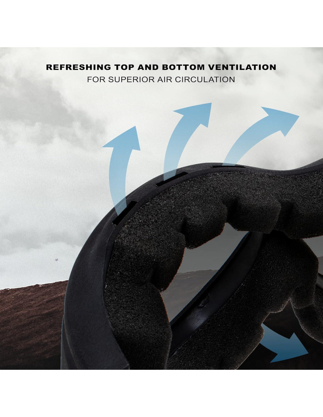 - Las ventilaciones superiores e inferiores permiten que las gafas respiren naturalmente y reducen el empañamiento, mientras que el acolchado de espuma suave y aireada proporciona comodidad adicional para el viaje que se avecina