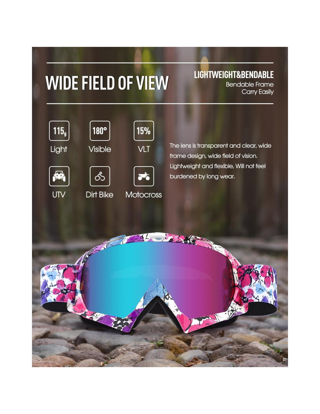 - MÚLTIPLES APLICACIONES: Vehículo todoterreno, motocicleta, motocross, automovilismo, bicicleta de tierra, MTB, fuera de carretera, esquí en nieve, deportes al aire libre, montar, kitesurf, esquí acuático, airsoft, paintball, snowboard, ATV y BMX, entre otros. Se ajusta perfectamente con el casco de motocicleta debido a su diseño de marco y las correas ajustables extra largas.
