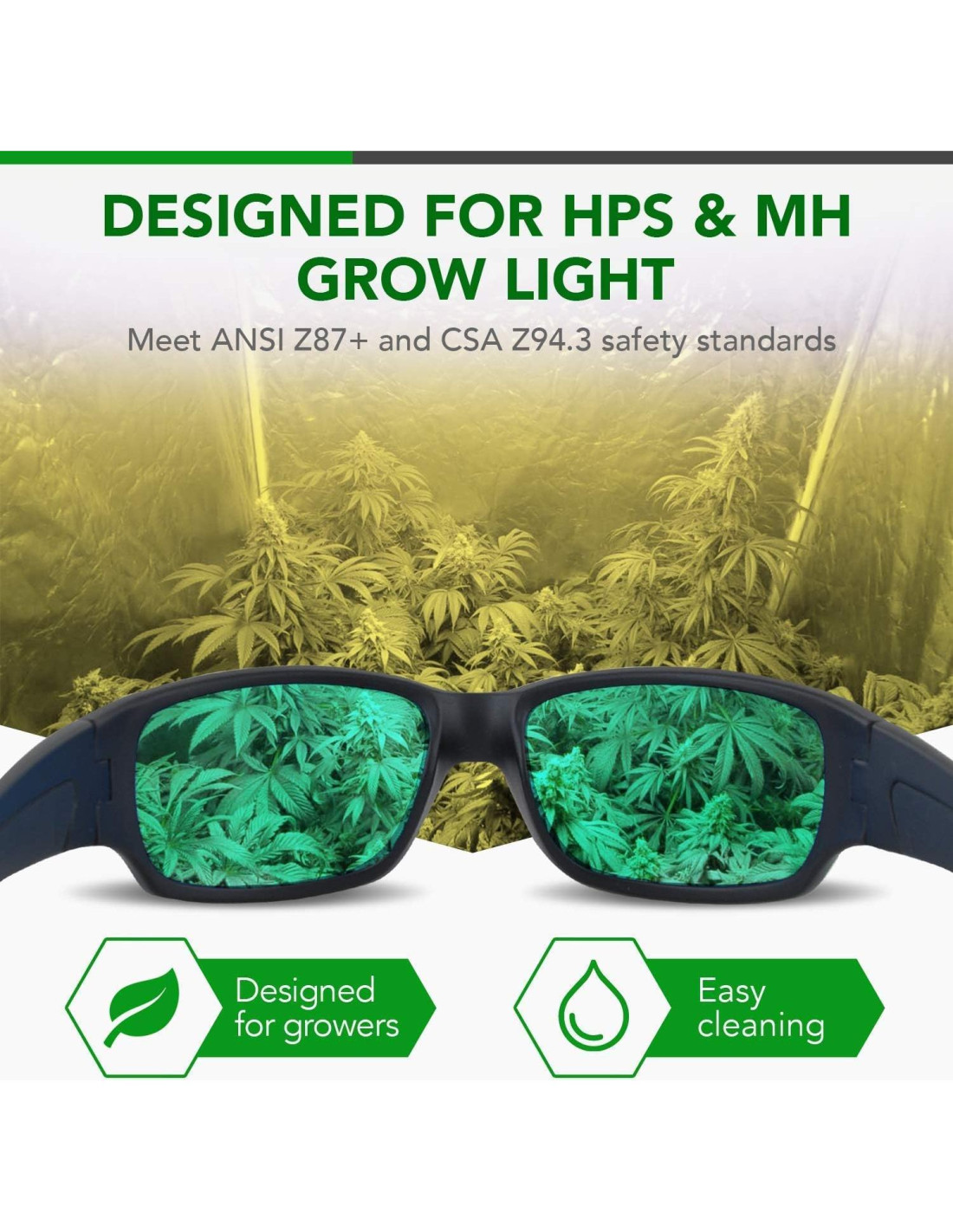 Por qué deberías usar gafas de sala de cultivo La razón principal para usar gafas de sala de cultivo es el daño irreparable que causa a tus ojos. Las gafas de sala de cultivo son gafas de seguridad especializadas diseñadas para ser utilizadas por cultivadores serios y profesionales que trabajan de cerca con luces de cultivo HPS o MH u otras luces de cultivo potentes de manera regular. Diferentes tipos de luz UV causan varios tipos de daño a los ojos. UVA causa cataratas, UVB causa quemaduras oculares. UVC también causa quemaduras oculares. Otro beneficio es poder ver el color real de la planta para encontrar problemas como insectos como ácaros araña o pulgones de raíz.