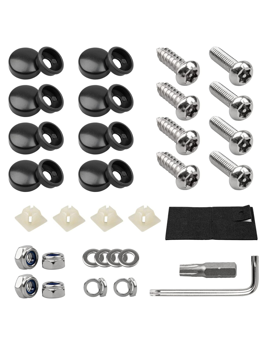 - Kits Completos de Tornillos para Placas de Matrícula: Tornillos de acero inoxidable x 8 pcs, almohadilla de espuma x 8 pcs, arandelas de tornillo x 8 pcs, cubiertas de tornillo x 8 pcs, insertos de tornillo de nylon x 4 pcs, tuerca negra x 4 pcs, llave especial en forma de ciruela para destornillador antirrobo M6