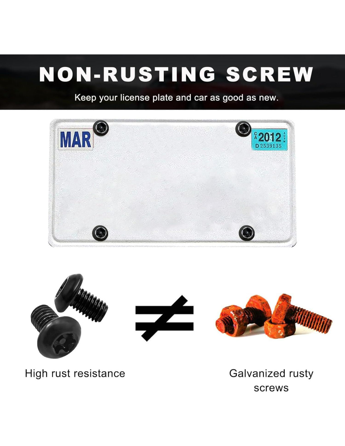 - [Excelente Material] : El kit de tornillos para placas de licencia de coche está hecho de acero inoxidable, que tiene una excelente resistencia a la corrosión y al óxido. Puede soportar diversas condiciones climáticas. Además, la superficie de los tornillos ha sido ennegrecida para mejorar la resistencia a la abrasión, haciéndolos menos susceptibles a rayones y desvanecimiento en el uso diario.