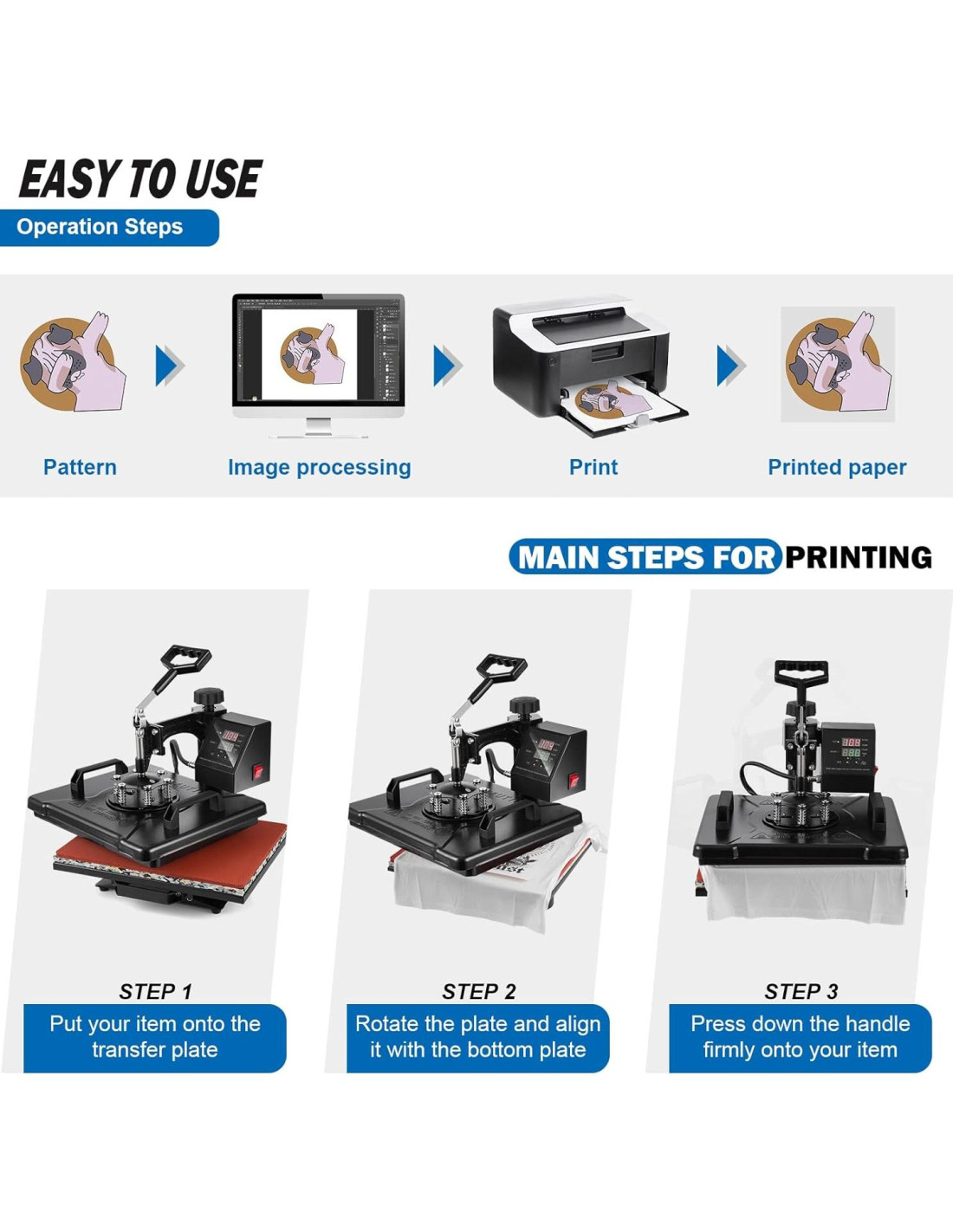 - Diseño de Rotación de 360 y Riel Guía -- Con un movimiento de giro de 360 grados completamente rotado y un diseño de riel guía inferior, permite que el elemento calefactor se mueva de manera segura a un lado, reduciendo la posibilidad de contacto accidental, también facilita el reemplazo de la prensa de platos y la prensa de gorras. La base fuerte en la parte inferior y el botón de presión superior lo hacen más estable al usar, esta máquina de prensa de calor proporciona una presión completa de manera directa y uniforme, garantizando la calidad de las transferencias terminadas.