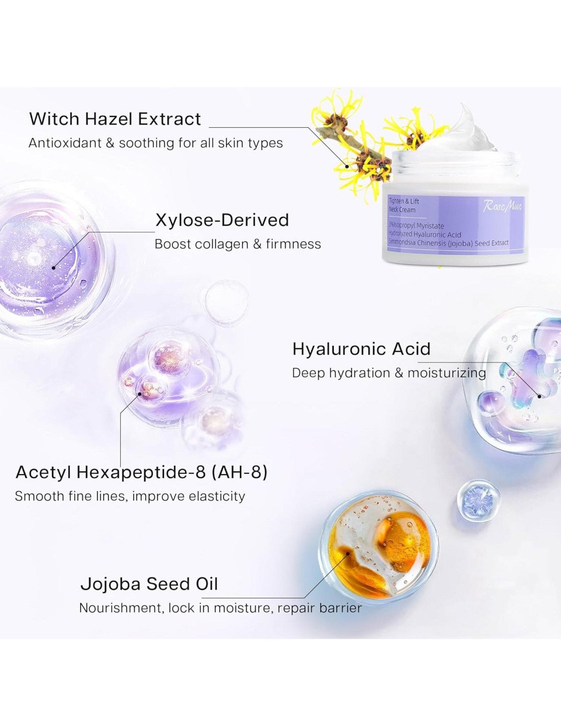 - Beneficios antienvejecimiento impulsados por AH-8 y derivados de xilosa: Esta fórmula avanzada combina Acetil Hexapéptido-8 (conocido como AH-8) y un ingrediente derivado de xilosa para aumentar la firmeza natural de la piel, suavizar arrugas, mejorar la elasticidad y reducir la piel flácida en el cuello, la línea de la mandíbula y el pecho, dejando la piel visiblemente más firme y juvenil.