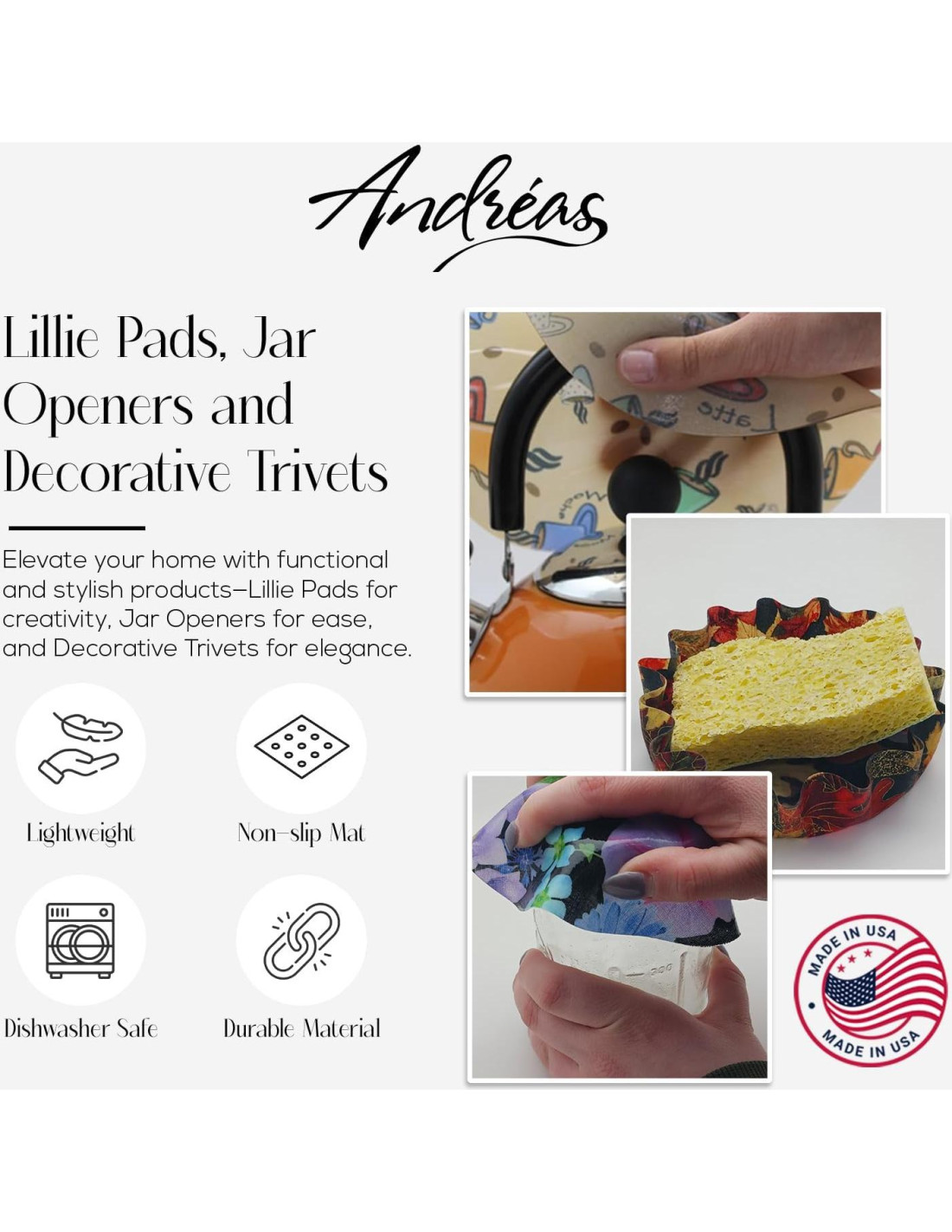 - MULTIPLES USOS: Los abre frascos de silicona Andreas están diseñados con un lado rugoso y un lado liso para un agarre fácil y firme para frascos y tapas difíciles. Hechos de silicona de alta calidad y la tela de tu elección, nuestros abre frascos son aptos para lavavajillas y pueden incluso funcionar como peladores de ajo.