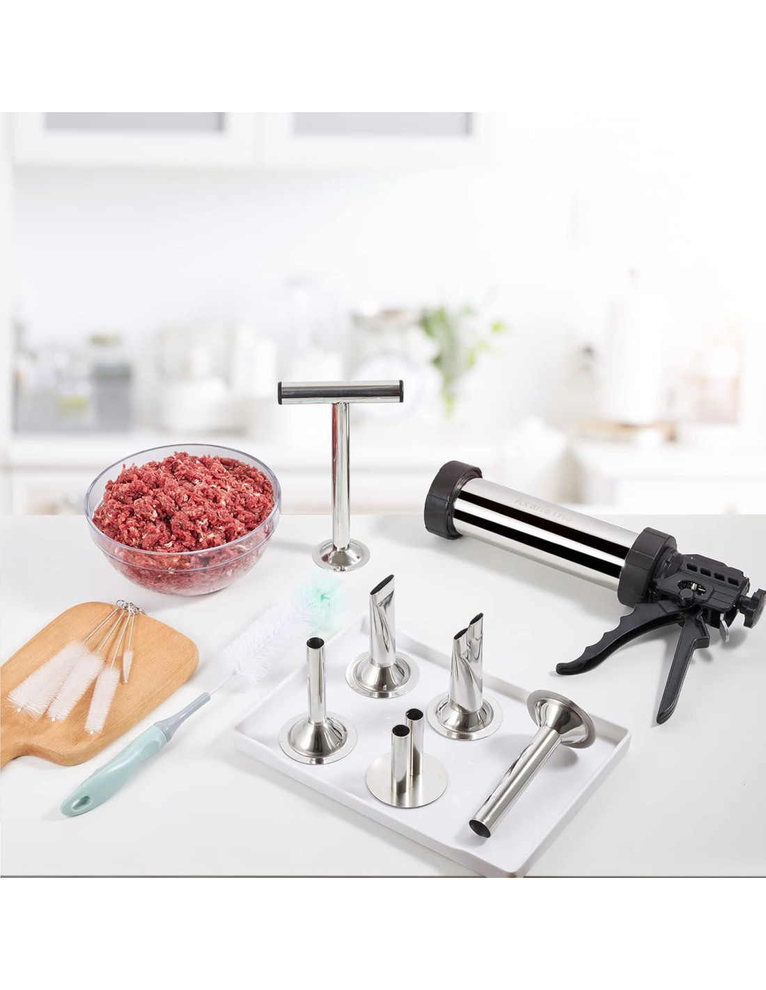 - [PISTOLA PARA JERKY DE ACERO INOXIDABLE] Nuestros kits de pistola para jerky de acero inoxidable están equipados con un tubo de acero inoxidable de grado alimenticio, 5 boquillas de acero inoxidable, 5 cepillos de limpieza y 1 empujador de carne de acero inoxidable, para hacer varios jerky y salchichas. El empujador de carne de acero inoxidable te ayudará a presionar la carne más firmemente para que el tubo pueda contener más carne