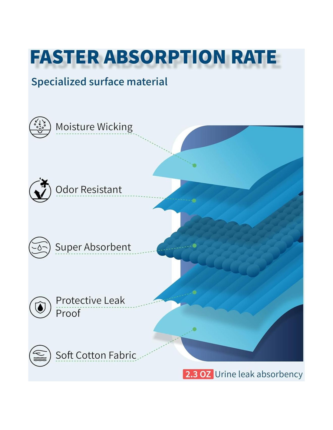 - Construcción de múltiples capas: Nuestra ropa interior protectora para hombres cuenta con una capa de rápida absorción, capa de control de olores, capa absorbente de bloqueo de fluidos, capa a prueba de fugas y capa de algodón suave para una protección y comodidad completas.
