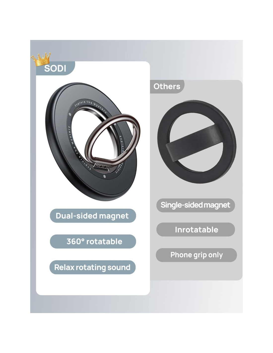 - [Imán Más Fuerte y Peso Más Ligero] El soporte magnético para teléfono SODI está compuesto por 16 imanes N52 y tiene una poderosa fuerza magnética cuando se usa con un anillo de metal, asegurando que tu teléfono se mantenga de forma segura en tu mano.