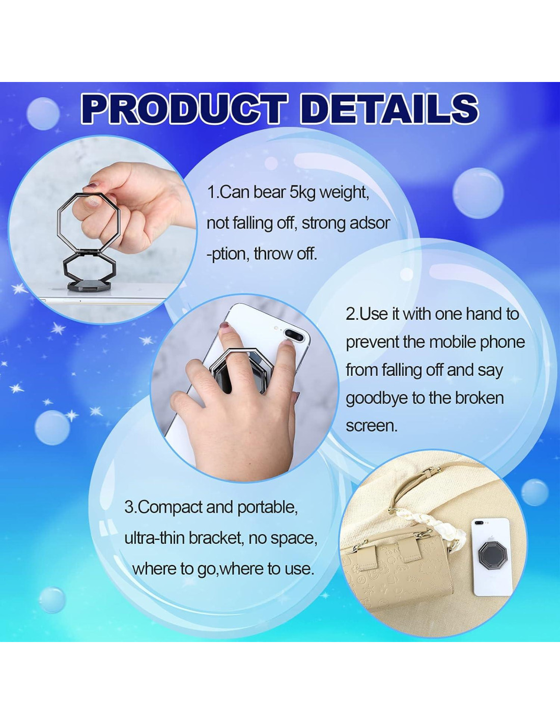 - Diseño flexible: este soporte de dedo para teléfono puede rotar 360 y voltear 180, admite el soporte horizontal o vertical del teléfono móvil, lo que puede ajustar el ángulo a voluntad para brindarte una visión ilimitada; Además, el soporte para teléfono puede soportar muchos pliegues sin aflojarse, el diseño plegable también es fácil de llevar y guardar en el bolsillo