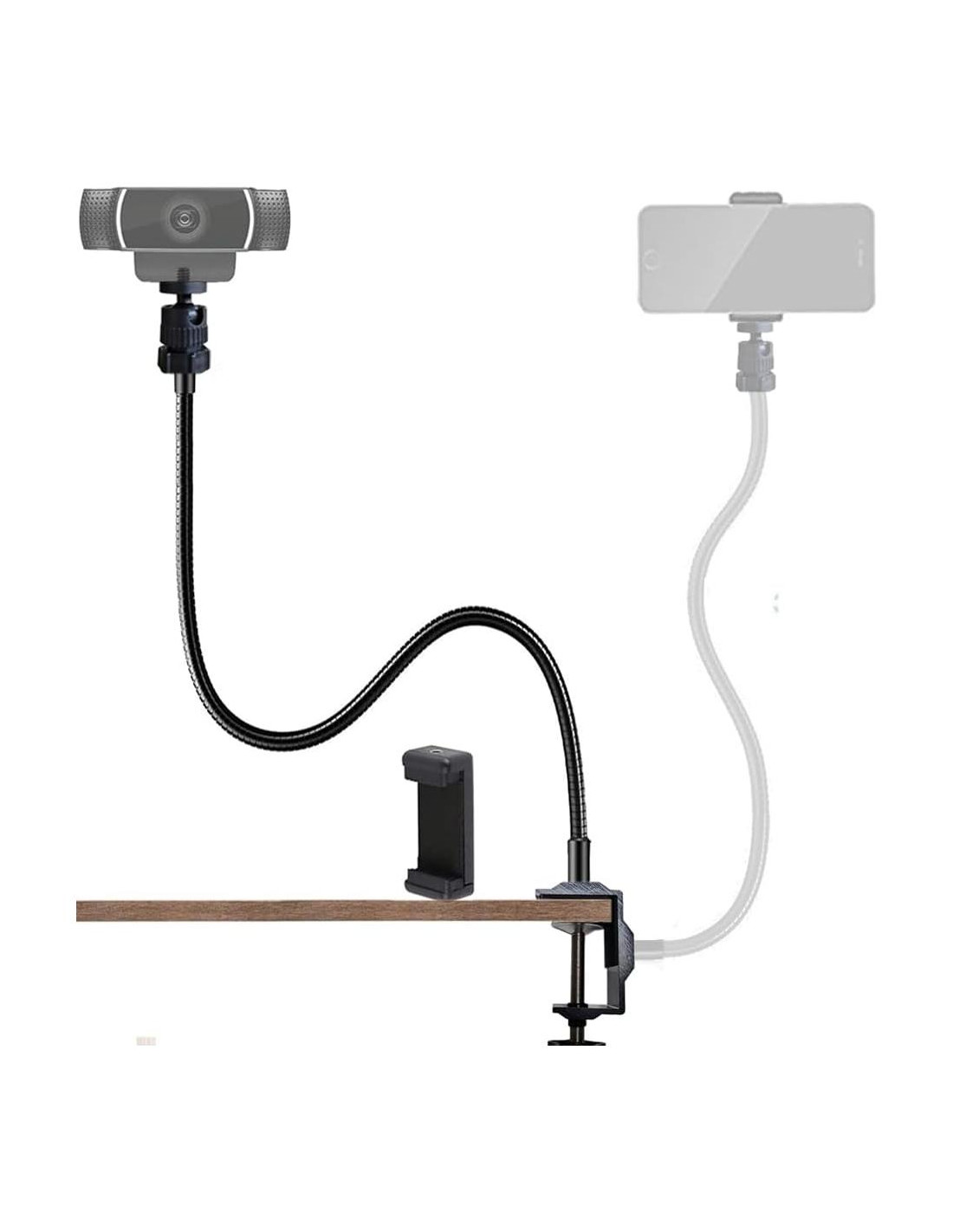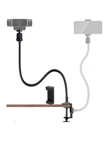 Soporte para teléfono con webcam 27" flexible ajustable para escritorio, soporte de cámara de escritorio con abrazadera para todos los teléfonos celulares, webcam Logitech C925e C922 C930e C930 C920 C615, etc. (Rosca de 1/4", abrazadera bidireccional) Características: - Diseñado especialmente para todos los teléfonos celulares, webcam Logitech C925e, C922x, C922, C930e, C930, C920, C615, Microsoft LifeCam Studio y otros dispositivos con roscas de 1/4". - Con kits necesarios (no incluidos), funciona para Gopro 7 6 5 4 3 2 1 session y otras cámaras de acción. - Hecho de acero de alta calidad, muy resistente y duradero. - El brazo flexible puede extenderse hasta un máximo de 27 pulgadas (70 cm). - Diseñado para soportar dispositivos de hasta 1.35 libras (600 g). - Viene con un soporte de teléfono ajustable de 2.2 a 3.8 pulgadas (5.6 a 9.7 cm) de ancho, se adapta a todos los teléfonos celulares. - Abrazadera de escritorio ajustable [bidireccional] con almohadilla antideslizante de aleación de aluminio que se adapta a escritorios de hasta 2.4" (6 cm), funciona en ambas direcciones. Especificaciones: Material: Acero premium, aleación de aluminio y plásticos ABS Tamaño de rosca de conexión: Rosca estándar de 1/4 de pulgada Tamaño del brazo flexible: 70 cm (largo) x 1.2 cm (diámetro) Soporte para teléfono: Ajustable de 2.2 pulgadas a 3.8 pulgadas Abrazadera de escritorio: 6 cm (máx), funciona en ambas direcciones Peso soportado: 1.35 libras (0.6 kg) (máx) Encuentra soporte de brazo de tijera para webcam/teléfono buscando B07V8M5HHJ. Encuentra soporte de brazo de tijera para micrófono buscando B07DHFDDS1. El paquete incluye: - 1x brazo flexible de 27" - 1x abrazadera de escritorio bidireccional - 1x cabeza de trípode con rosca de 1/4" - 1x soporte para teléfono