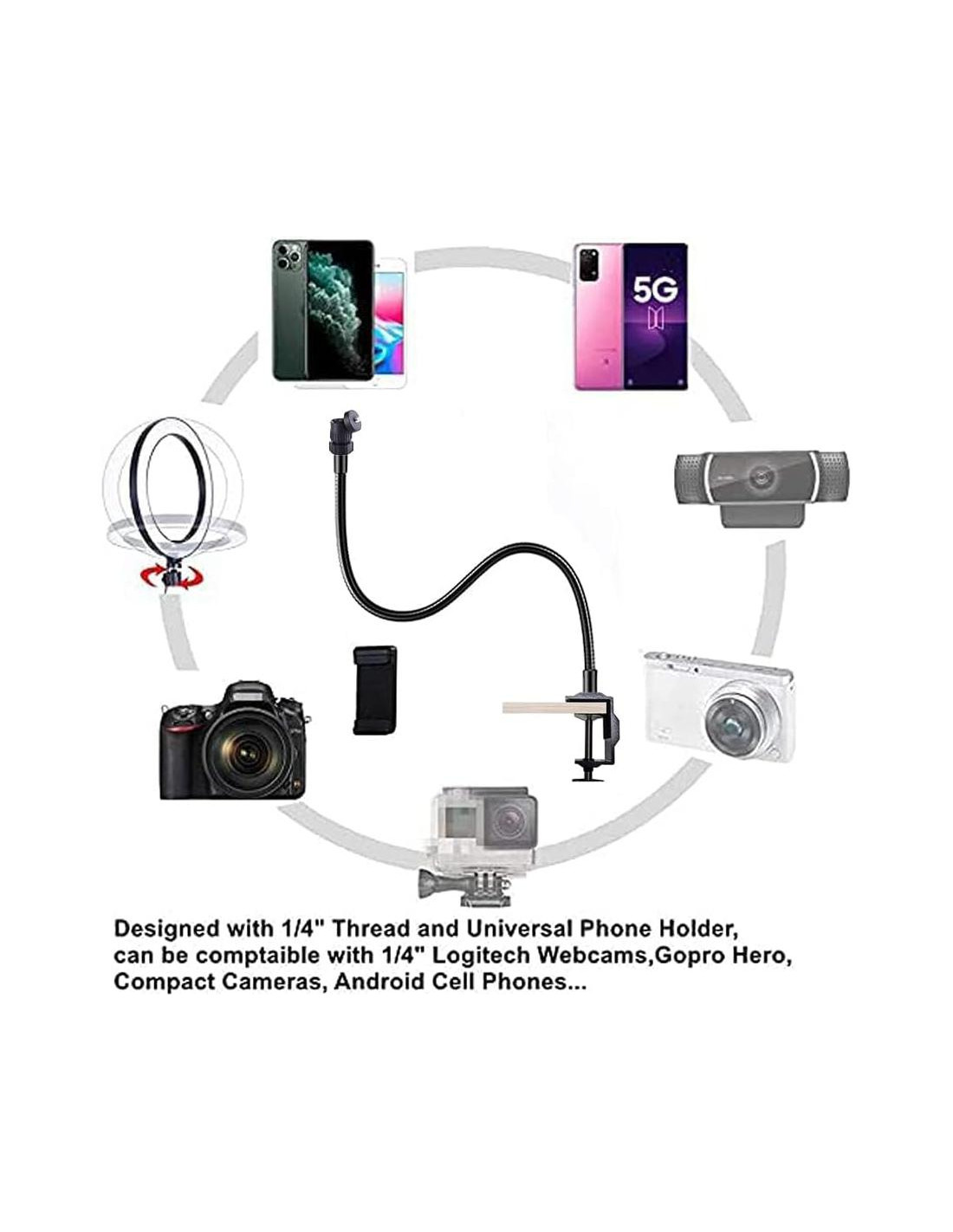 - [Contenido del paquete] : 1x brazo flexible de 27", 1x abrazadera de escritorio bidireccional, 1x cabeza de trípode con rosca de 1/4", 1x soporte para teléfono