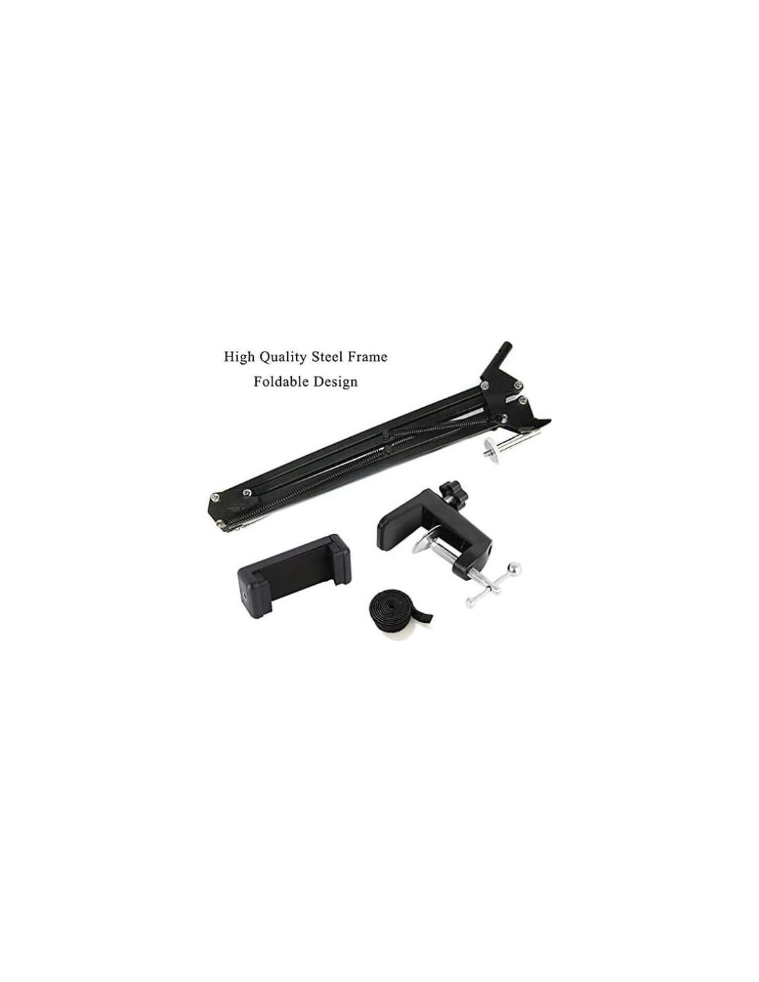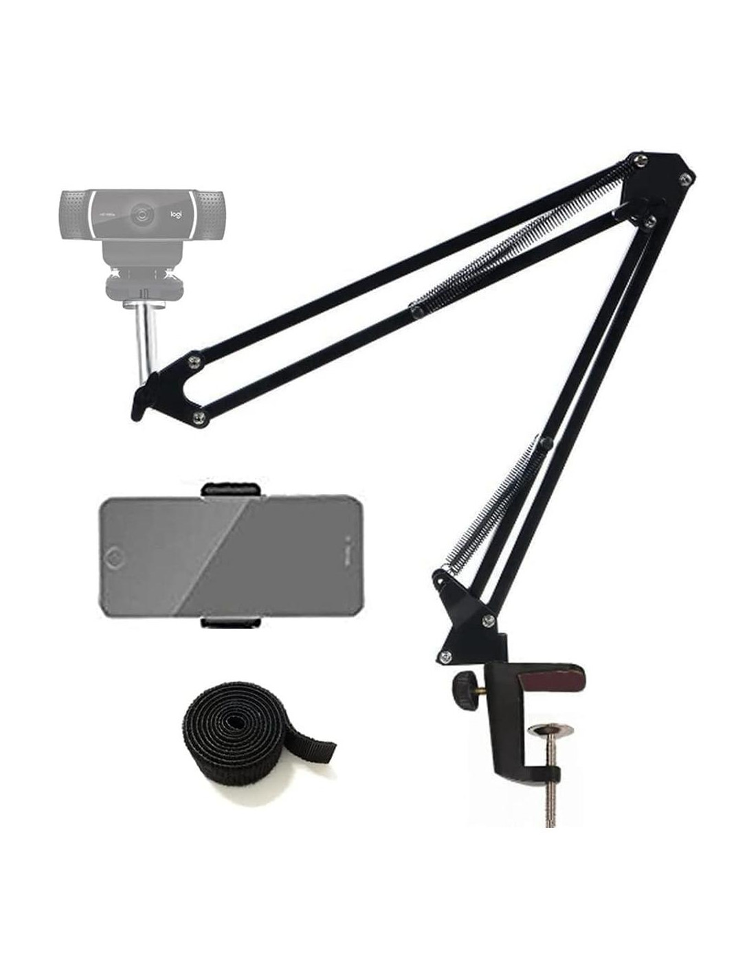 Soporte de brazo de tijera con rosca estándar de 1/4 y soporte de teléfono ajustable de 2.2"-3.8" (5.6cm-9.7cm) de ancho. Con el diseño mejorado de alta resistencia, ofrece una gran capacidad de carga y un rendimiento prolongado. Además, las patas ajustables permiten llevarlo fácilmente y ajustar el ángulo y la altura adecuados para una grabación o presentación perfecta. Diseñado especialmente para Logitech Webcam C922x C922 C930e C930 C920 C615, Brio 4K, Microsoft LifeCam Studio, todos los celulares y otros dispositivos con orificio roscado de 1/4. Doble resorte de suspensión en cada brazo, muy robusto y duradero, alcanza hasta 70cm. Hecho de aleación de aluminio, abrazadera ajustable para colocación en superficies irregulares (grosor dentro de 5.3cm). Viene con un soporte de teléfono ajustable de 2.2"-3.8" (5.6cm-9.7cm) de ancho para sostener el smartphone y 24" (61cm) de correas de sujeción incluidas para la gestión de cables. Tipo plegable, ángulo ajustable, cómodo para tirar y ajustar. Tornillo ajustable que permite ajustar el ángulo y la altura adecuados para grabar o mostrarte perfectamente.