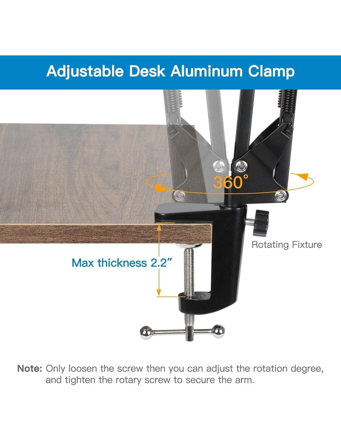 - [Mejora] Abrazadera de escritorio de aleación de zinc con almohadilla antiarañazos que se adapta a escritorios de hasta 2.1" (5.3cm), polo de conexión de webcam antideslizante y anti-caída con rosca de 1/4, soporte de teléfono ajustable para todos los celulares, brazo extensible hasta 28" (70cm), viene con gestión de cables de 24" (61cm)