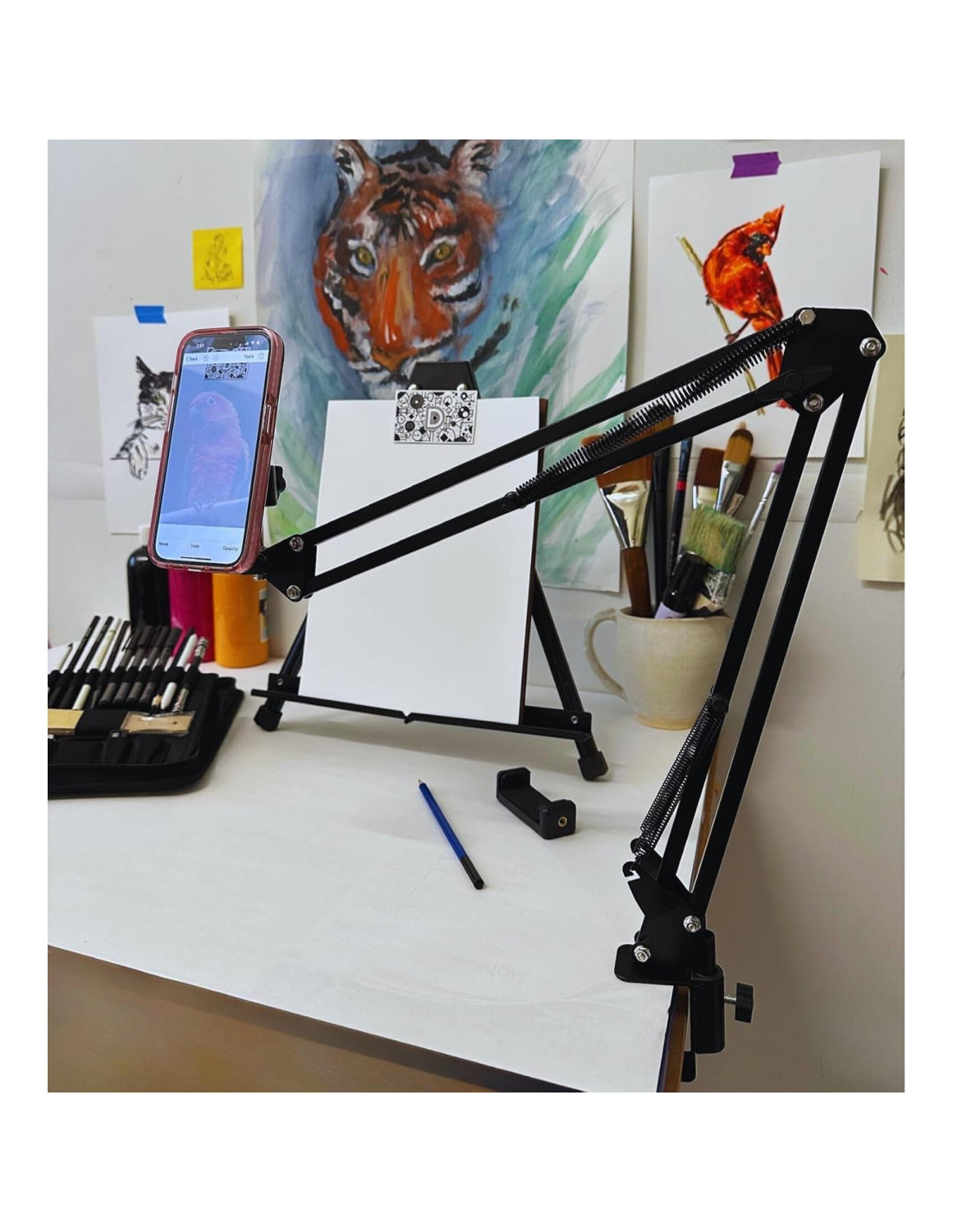 El soporte de cámara web y teléfono en la parte superior Da Vinci Eye es un soporte flexible de brazo de tijera para teléfonos móviles, cámaras y cámaras web. Este conjunto incluye un adaptador compatible con MagSafe para teléfonos y fundas que tienen esta capacidad. La clip para teléfono incluida se expande para ajustarse a los iPhones Pro Max más grandes SIN una funda. Si tienes el iPhone de mayor tamaño, debes quitar la funda; para teléfonos de tamaño normal no necesitas quitar la funda. Este soporte en particular es perfecto para el modo AR de Da Vinci Eye, ya que es rígido para mantener tu teléfono de manera segura en su lugar al usar los controles de tu dispositivo, pero flexible cuando deseas moverlo. El accesorio de cabezal esférico incluido al final del soporte te brinda la flexibilidad de girar y posicionar tu dispositivo de cámara en todos los ángulos, a diferencia de otros soportes. Además de ser un accesorio perfecto para el proyector de arte AR de Da Vinci Eye para teléfonos móviles, también se puede usar para cámaras DSLR ligeras, cámaras web o cualquier otra cosa que normalmente encajaría en un trípode, ya que viene con un tornillo estándar de 1/4. Con accesorios adicionales, puedes usar este soporte con tabletas; sin embargo, esos accesorios no están incluidos.