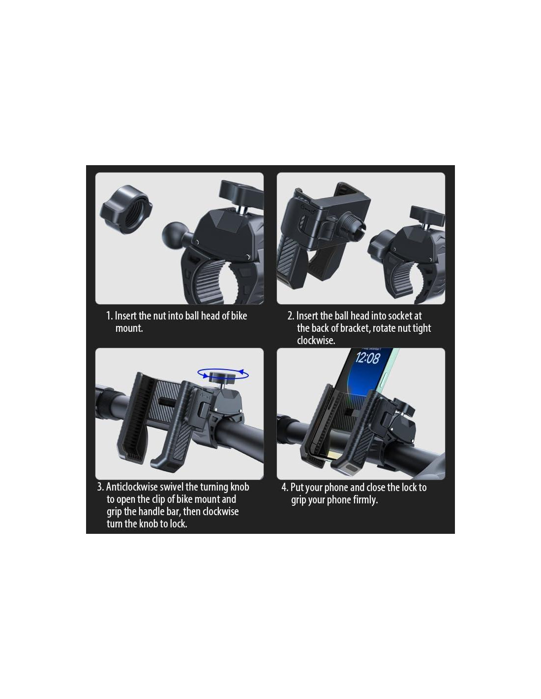- Clip de Manillar Rápido: Este soporte para teléfono de bicicleta universal ha mejorado su clip de manillar, facilitando mucho la instalación. Gira la perilla en el clip de manillar para ajustar el clip al manillar, y luego aprieta el tornillo para fijarlo. No se requieren herramientas. El clip de manillar es aplicable a bicicletas, motocicletas, scooters eléctricos, cochecitos de bebé, carritos de compras, bicicletas de ejercicio en interiores, cintas de correr, etc. El diámetro aplicable del manillar varía de 1.7 a 4.4 cm.