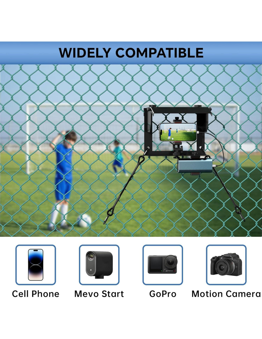- Sistema de montaje mejorado - Estabilidad sólida como una roca: El soporte de cerca para teléfono cuenta con una configuración reforzada: ganchos de metal resistentes en la parte superior y ganchos de cuerda en ambas esquinas inferiores para una estabilidad triple. Combina seguridad con resistencia a impactos y se mantiene firmemente sujeto a cercas de eslabones de cadena mientras las pelotas lo golpean, convirtiéndolo en el kit de montaje revolucionario perfecto para grabaciones deportivas.