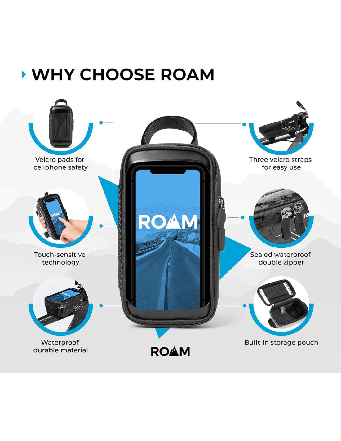 - Mantén tu smartphone de forma segura con la Bolsa de Teléfono Impermeable Roam. Las tres correas aseguran este bolsillo de almacenamiento al marco de tu bicicleta. La posición contra la dirección hace que sea fácil acceder a tu smartphone mientras montas.