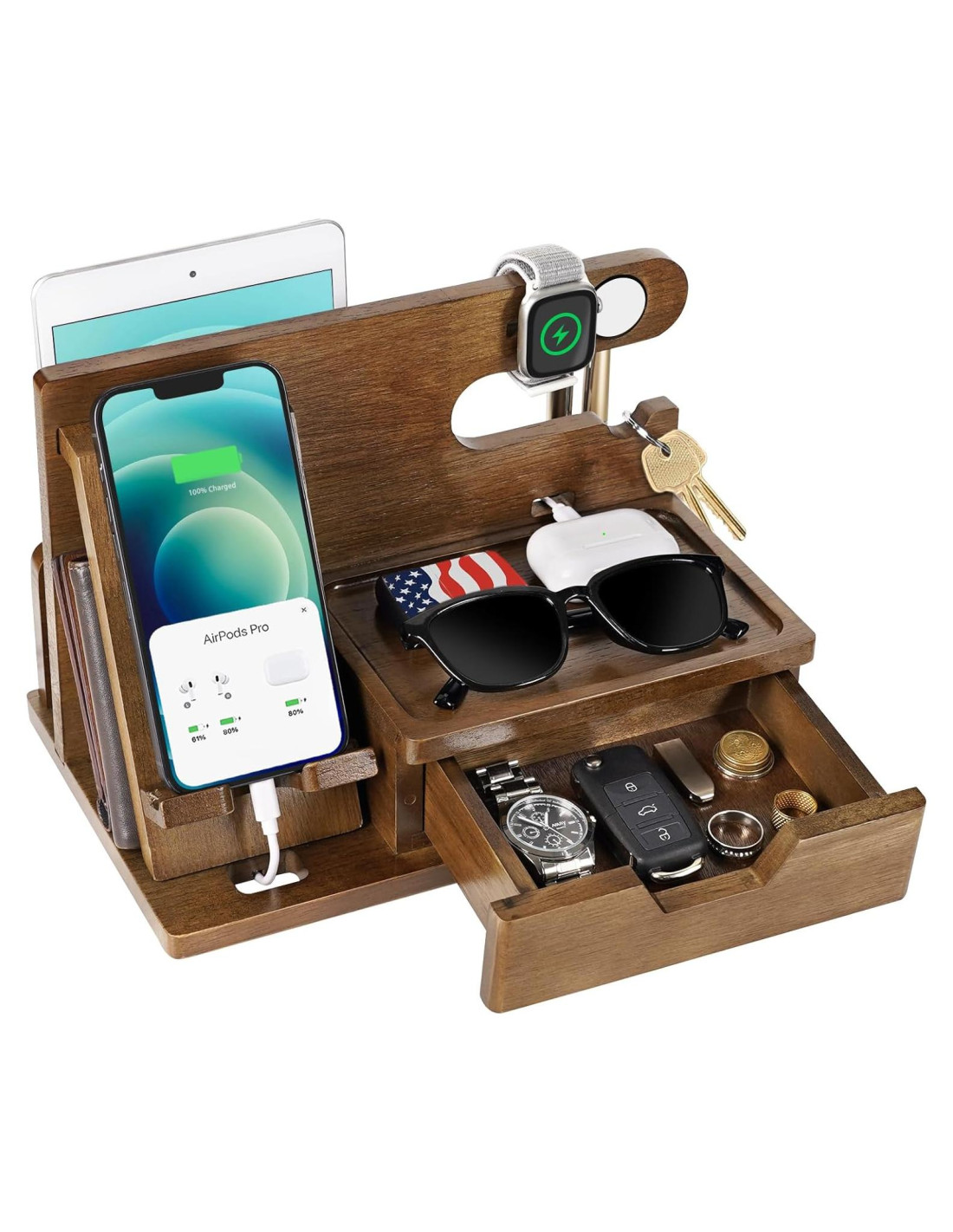- Diseño Reflexivo: Con un agujero de carga dedicado, nuestro soporte de teléfono de madera asegura una carga conveniente. También funciona como un organizador de estación de acoplamiento compacto, capaz de sostener de manera segura tu reloj y organizar pequeños artículos, como un buen ayudante en varios entornos como la oficina, la sala de estar y la entrada. Regalos perfectos para el Día del Padre para papá